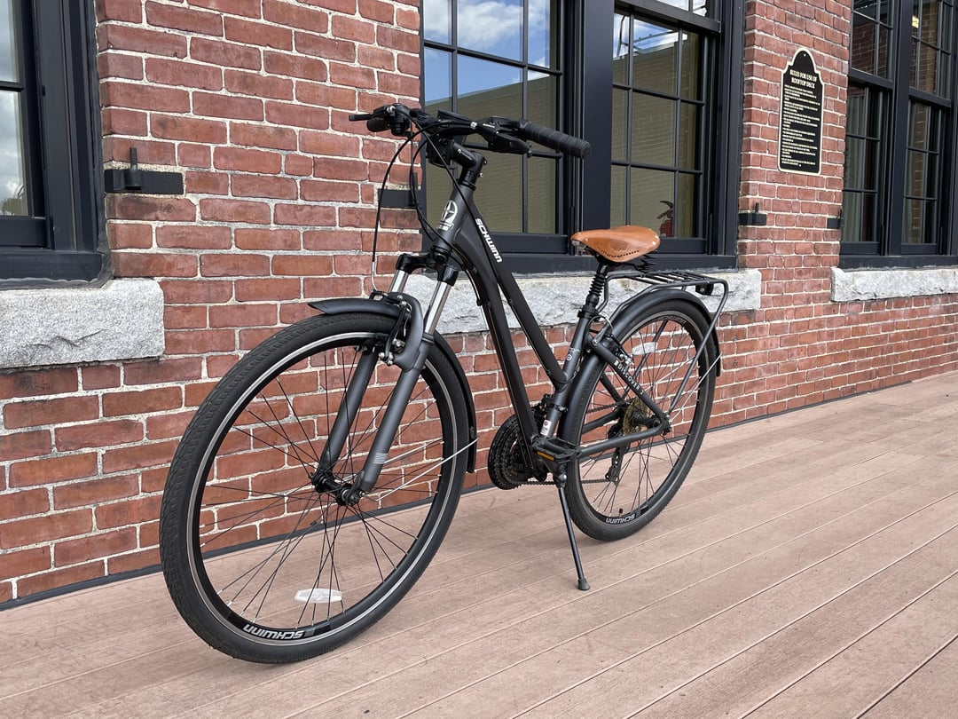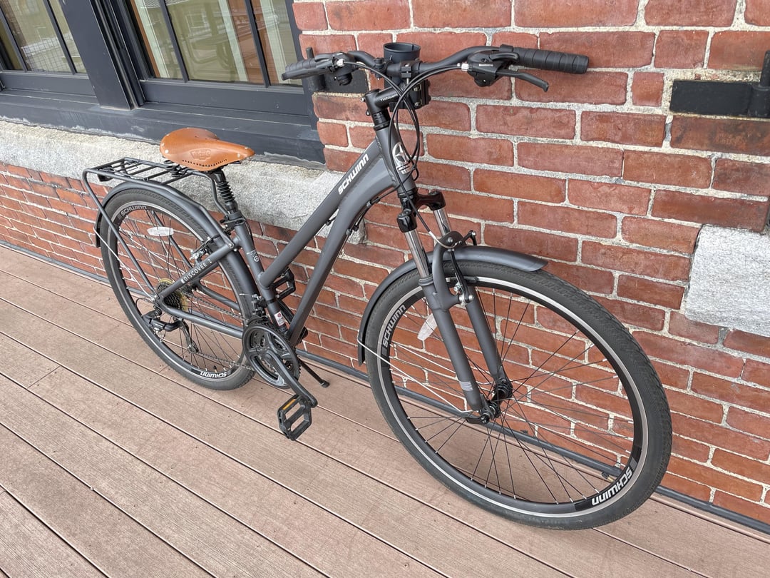 Unique ThinStem foldable handle bars allow bike to be stored in a narrow space, up against a wall, and allows easy movement through doorways — perfect for apartments or dorm rooms. Back rack and drink holder.