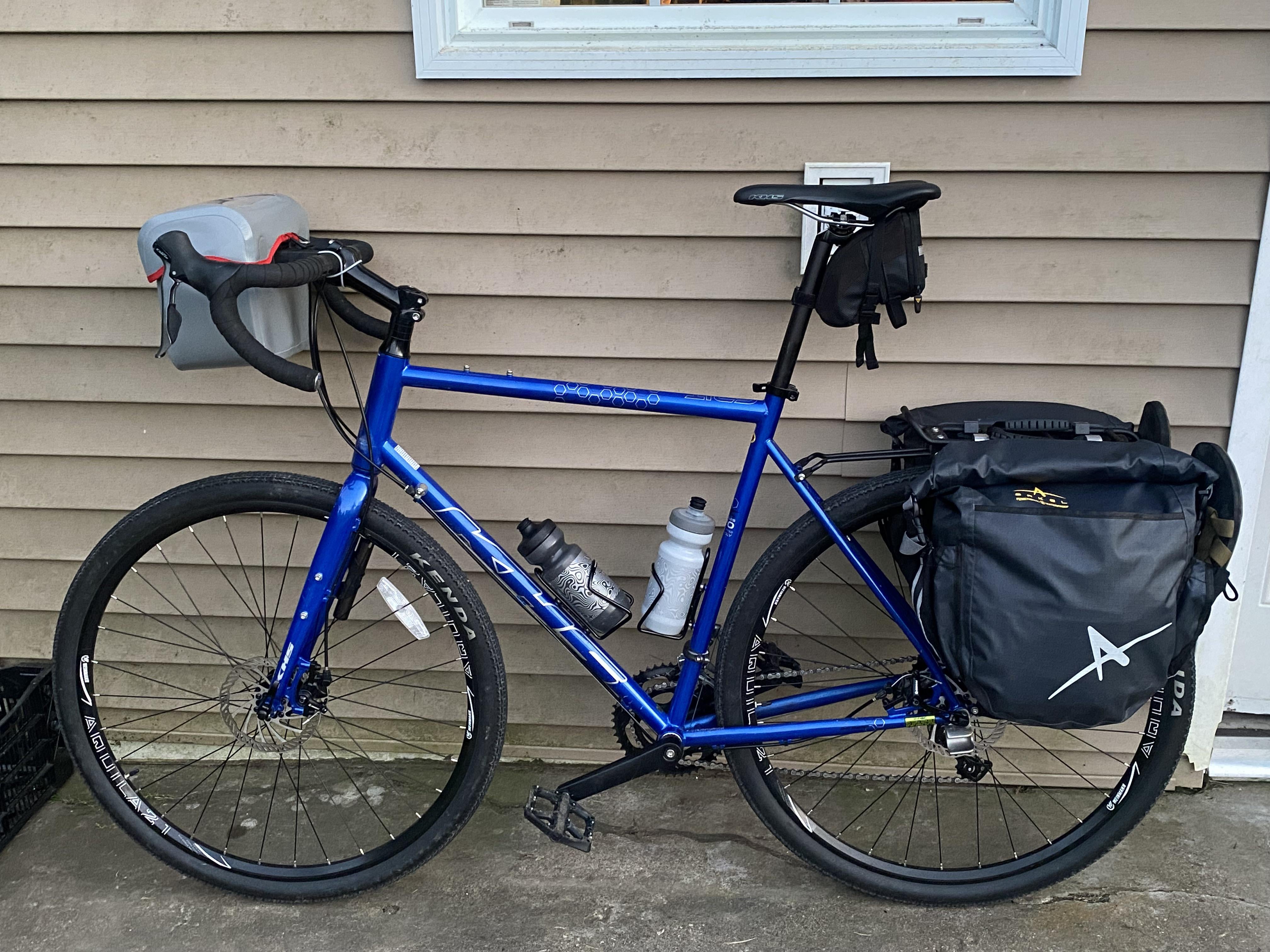 The Ortlieb Ultimate handlebar bag seemed to handle it all well. Got it on deep discount, and was a no brainer for fully waterproof additional storage for my cooking kit, ditty bag, FAK, and water filter.