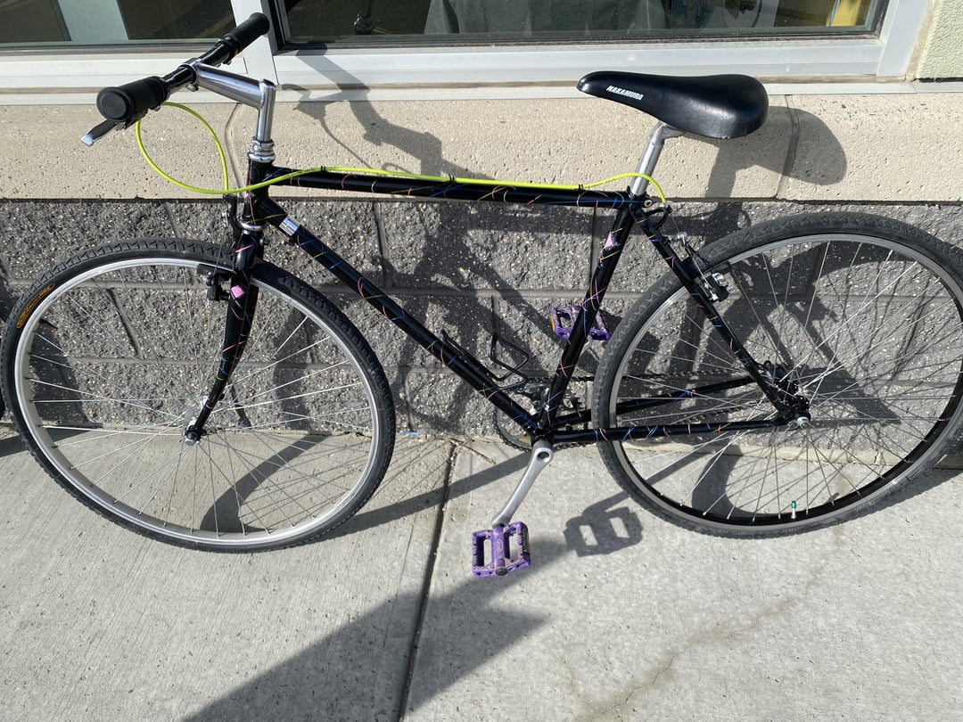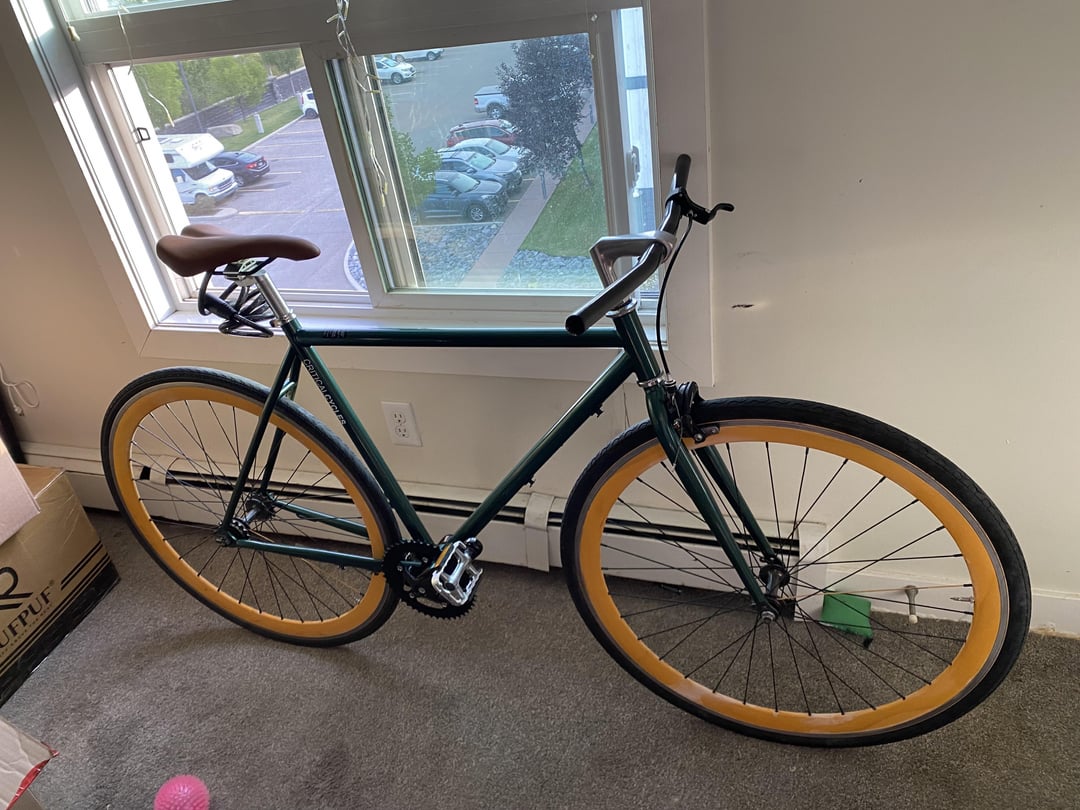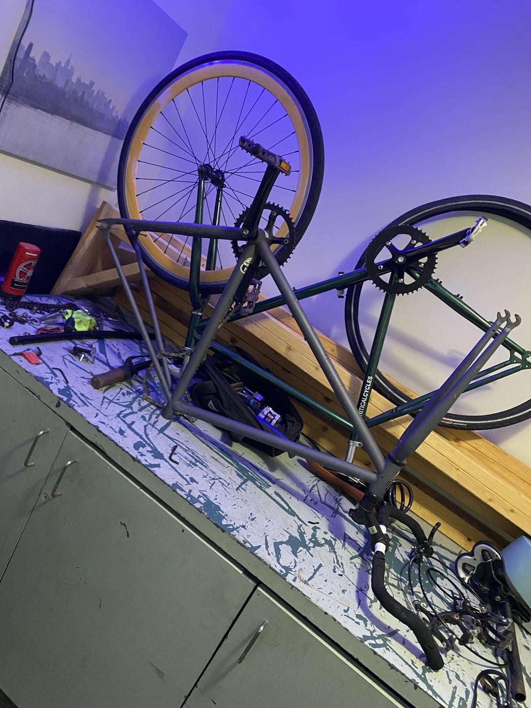 Update on my Green Critical bike. Went from a 3spd hub to flip flop. I bought a Pure Fix just to rob it for parts for both my bikes. Norco now has some sweet purple GT pedals. Green Critical has front brakes and wheels. Just waiting on chain tensioners, new tires/tubes and new grips to show up tomorrow and then my green bikes back in business. The Norco is a blast but I miss my main squeeze ! Gunna force a friend to build a single speed by giving him the frame and forks to build from in exchange for a beer or two at our local watering hole.