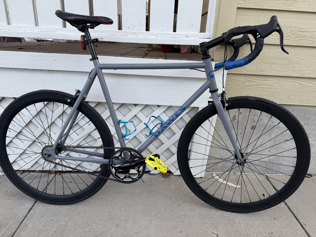 Updated this Dawes MTA single speed. The yellow was the stock setup. Stripped and repainted, added drop bars and brakes. New generic headset (original literally ell apart) and bottom bracket. Cranks and pedals we transplanted from another bike, including the 54t chainring. Have a 22t cog so running a 2.45 ratio. Wheels are new, no real big name brand, seat was transplanted also. May get better matching pedals at some point.
