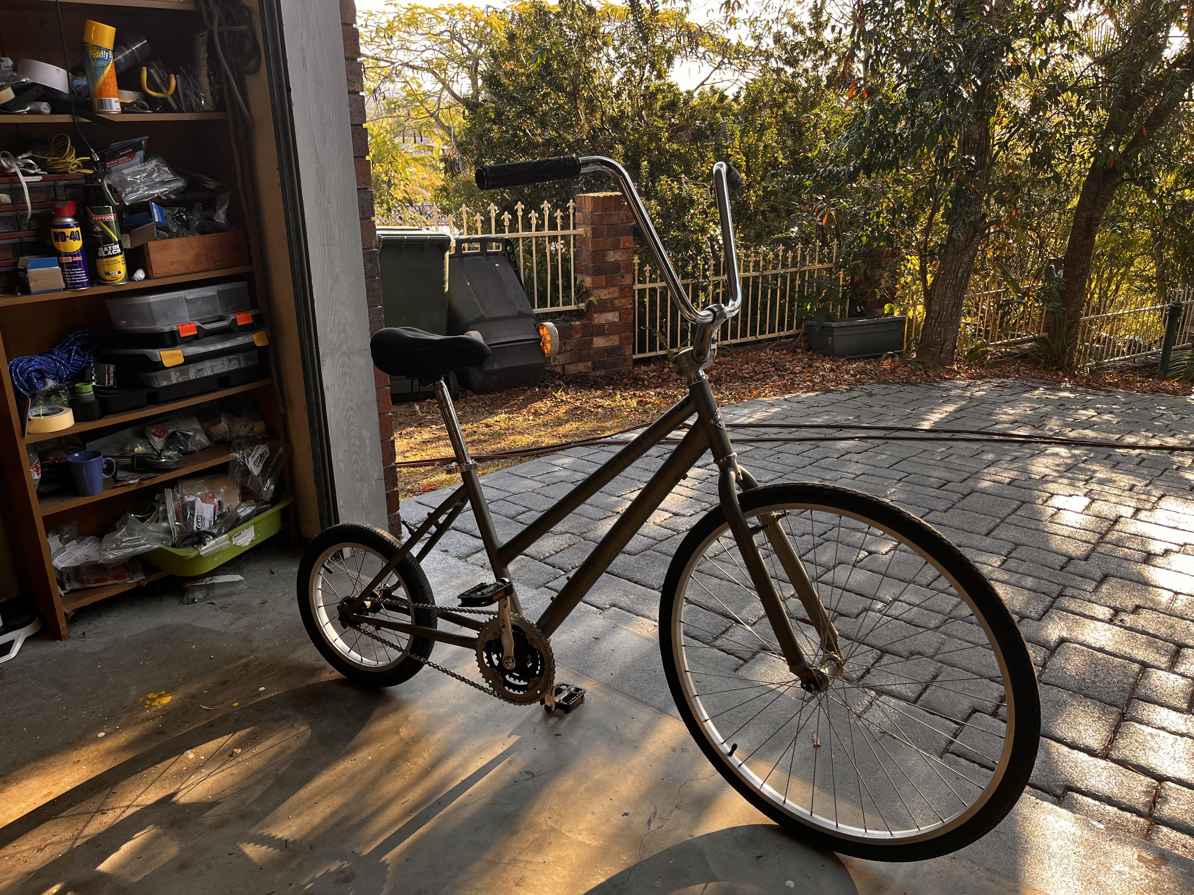 I built this bike off of a bike I found in a bush, 27.5 inch front wheel with a 16 inch rear wheel, took front derailleur ler off and put single speed chain on. EBay ape hanger bars for 30 bucks. The pedals Almost touch the ground when you riding so you have to be careful on corners lol.