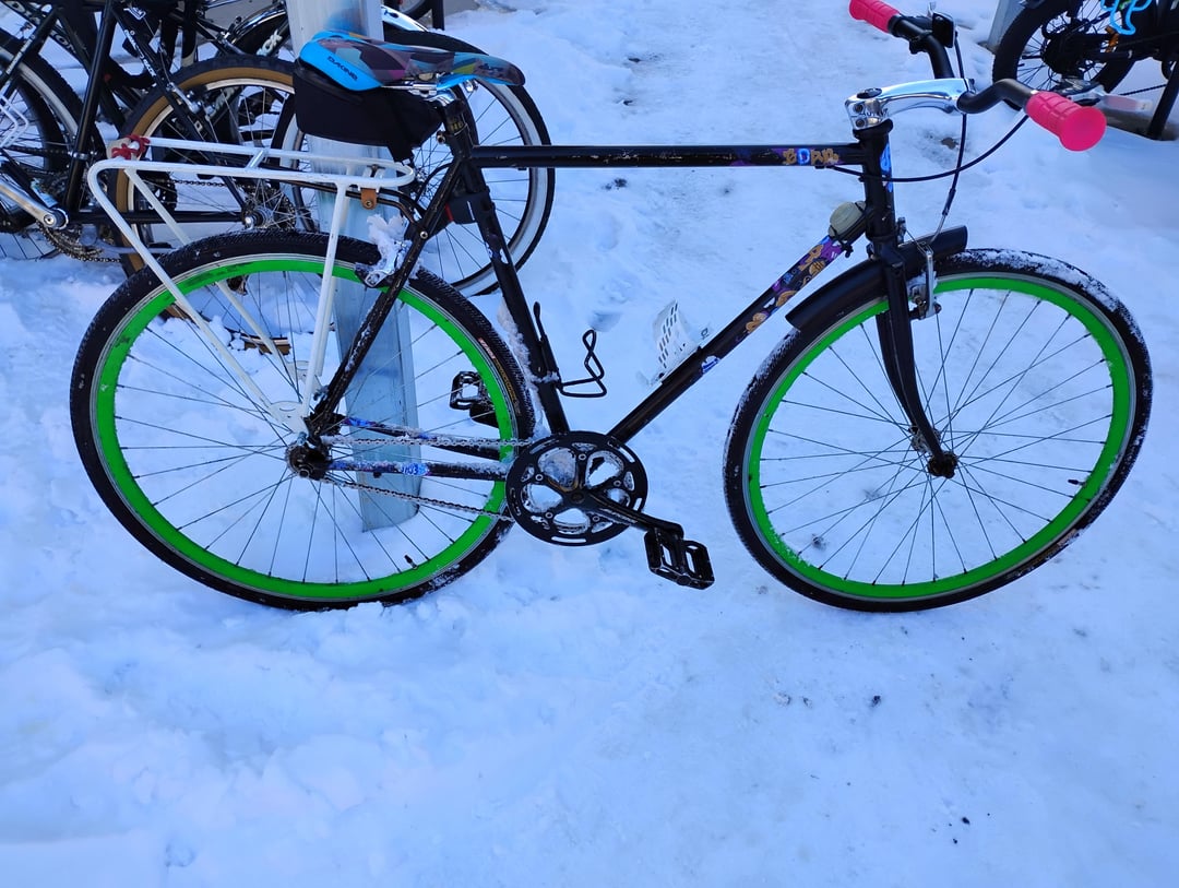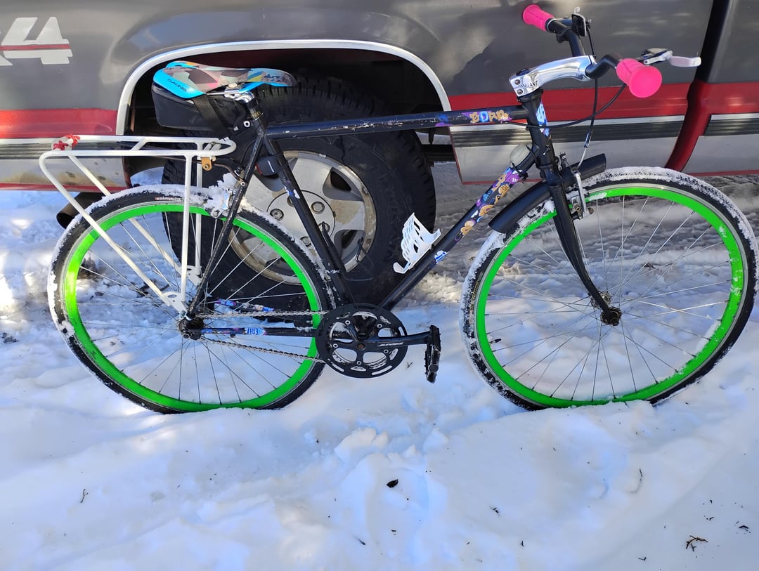 Facebook Twitter LinkedIn Pinterest Bluesky Threads Put a new SRAM chain, a rack, and a wald front fender. Honestly did okay in the snow 😂. Overall a successful test ride by 404errorcode2319 Bicycle Bike Fixed Gear Fixed Gear Bicycle Fixed Gear Bike Single Speed Cycles
