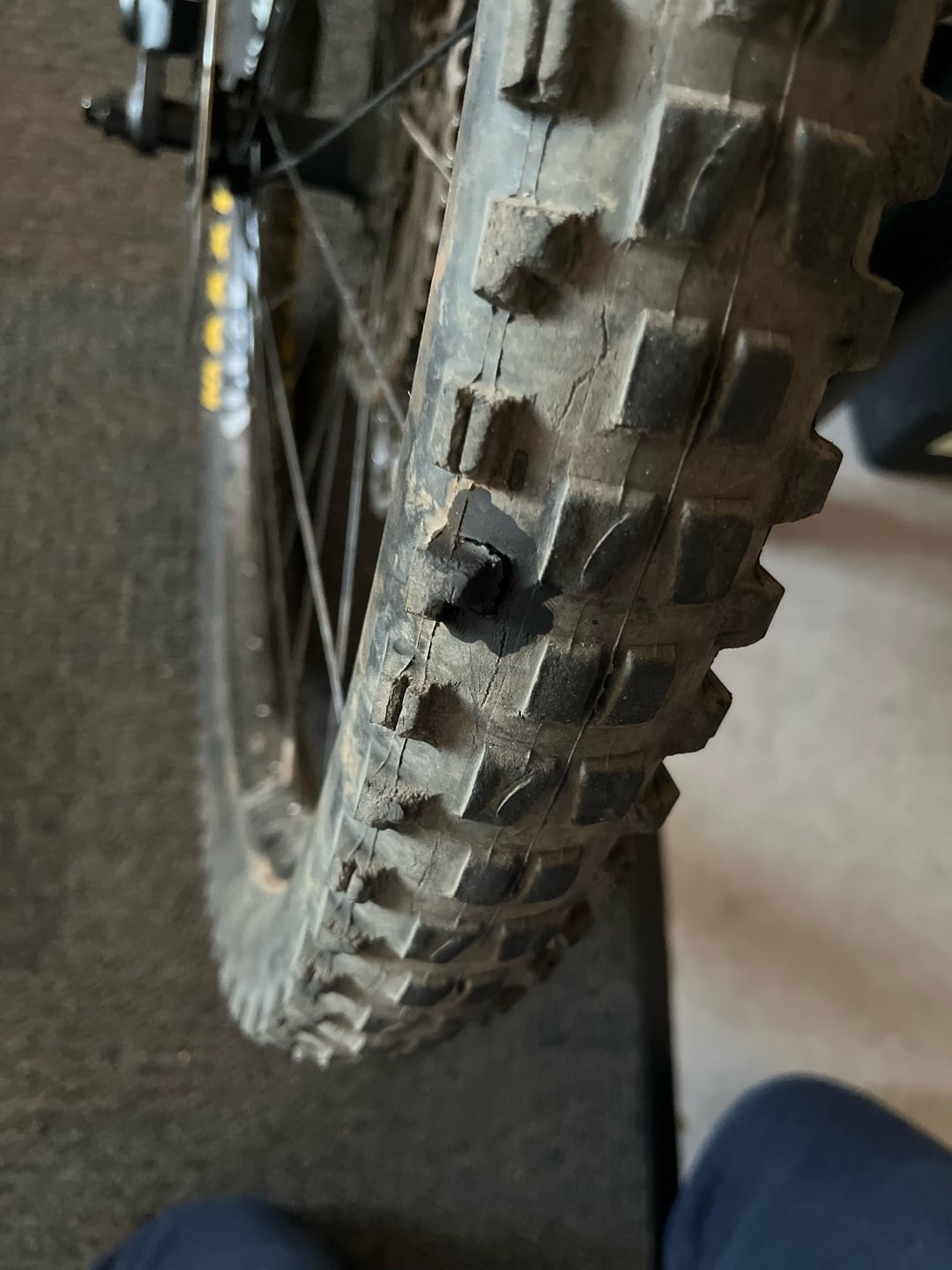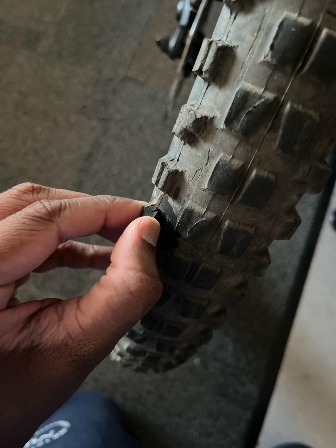 That’s just the knob tearing off, tyres will do that especially if the rubber is old and has seen a lot of sun, it’s nothing to really worry about but if you’re tearing a knob as a new rider on blue and green trails I’d personally replace the tyres.