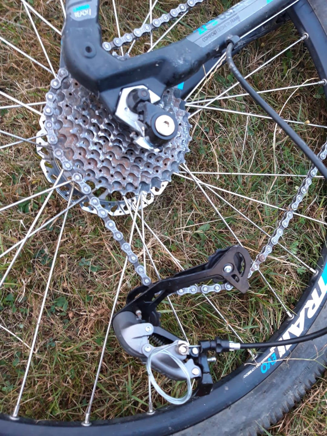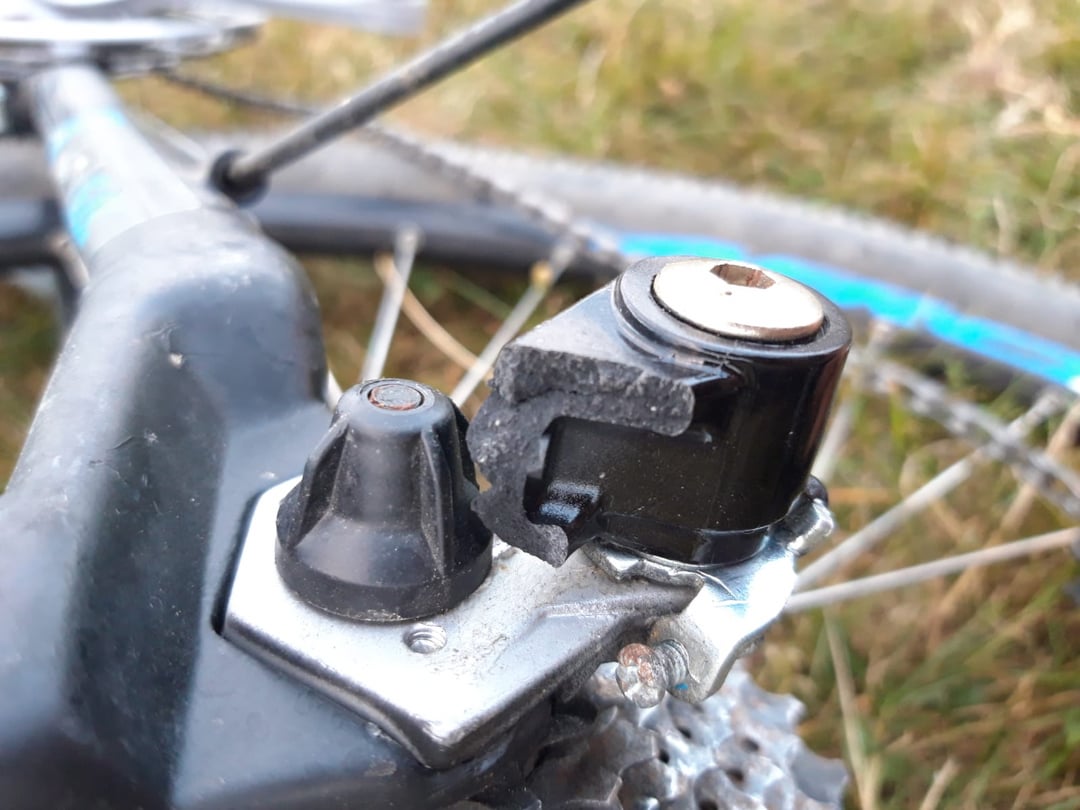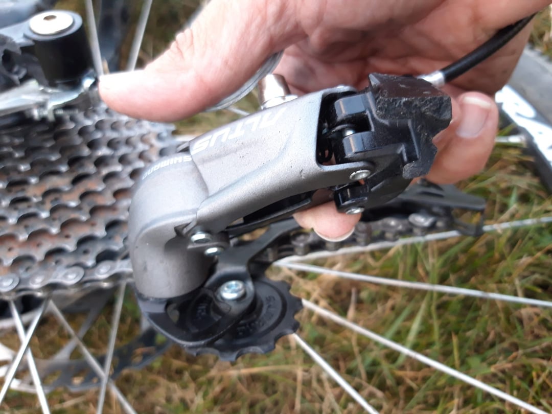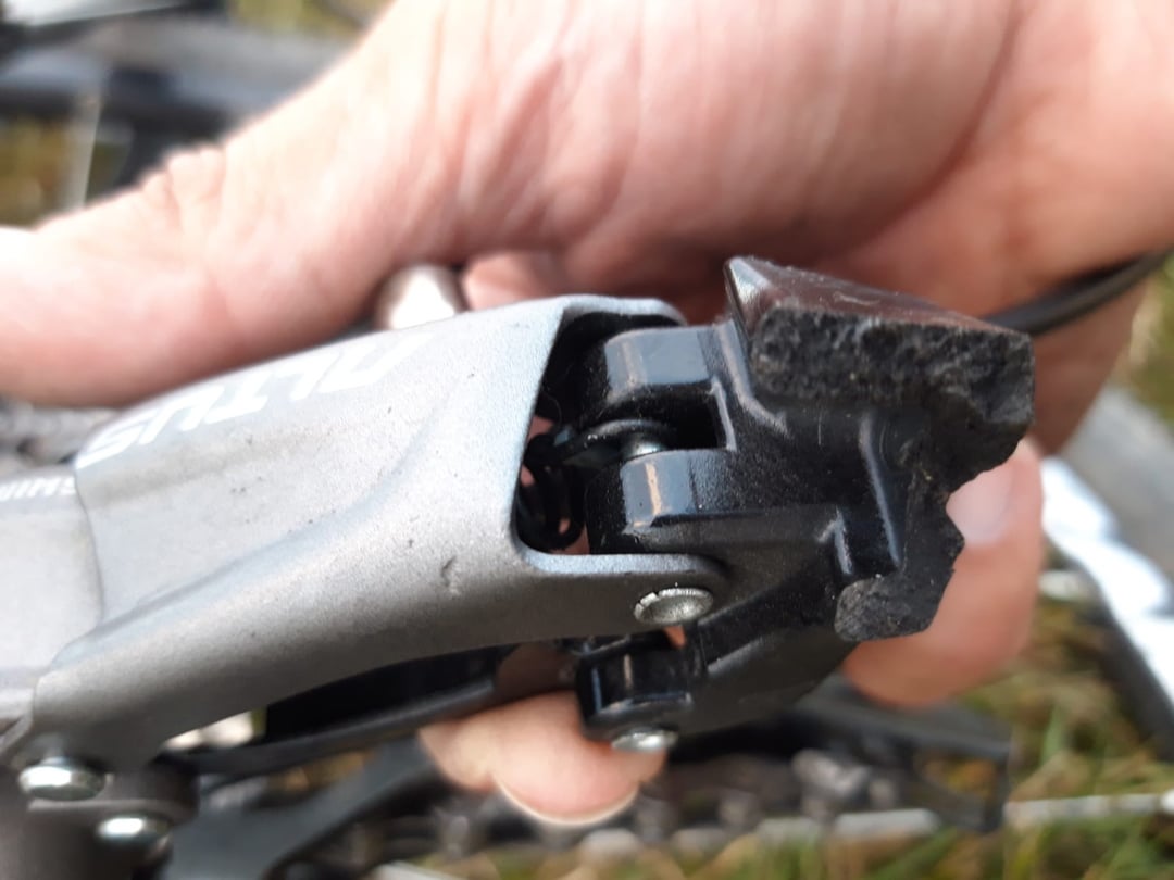 Caught my breath, then started climbing back up. I changed gears, then only went a few steps from the base of the slope when bang! The rear derailleur (as I now found out it’s called) snapped in two. It’s not the hanger or the chain; these look fine to me. It’s not bent. It’s broken like a twig. As if it was made of plastic. It can’t be plastic though, can it?