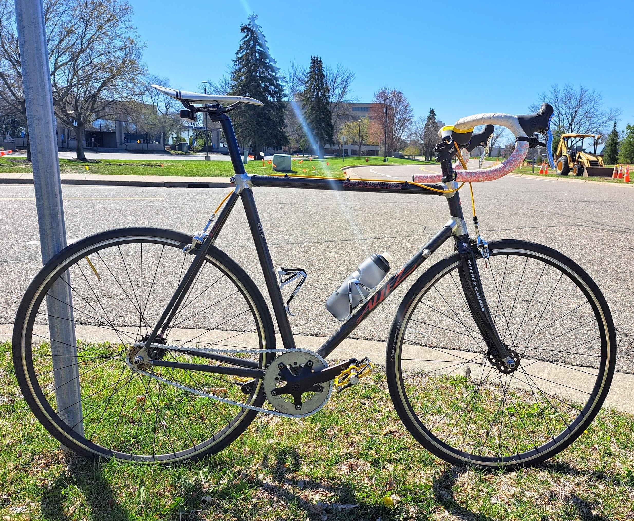 Bike is a 1990 Specialized Allez Epic – would've been a higher-spec road bike when it came out. It was already converted to singlespeed when I got it in ~2008 for $150 off craigslist (one heck of a first real bike for a highschool kid to luck into).