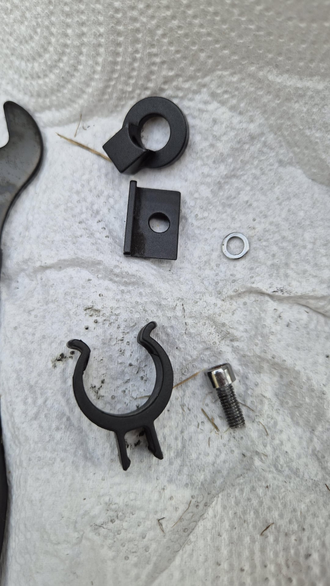 **Google search Nexus 3 speed** (or what ever speed combination you have) **exploded view**. This will give you a detail diagram of the order in which all the small parts are assembled. The aluminum black pieces are missing a bolt and nut and is a tensioner. The plastic half moon is part of the assembly to install the cable housing to the arm of the hub. The washer and allen bolt likely go together and probably go to attaching a rack/fender strut or something like that. In the second photo, the part pictured is the housing and shifter that engages the rod (shifts the gears). It has a screw or bolt on the underside that releases the cover and allows you to attach the cable. This all can be found if you also do a youtube search on how to install a nexus 3 speed shifter, and if you are patient you can find a video that walks you through the process of installing and adjusting these parts.