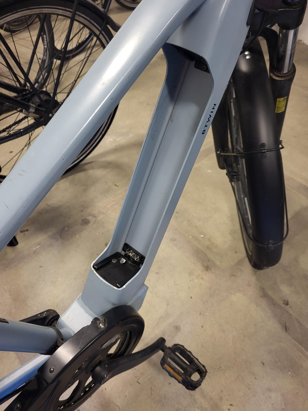 My e-bike has a different kind of battery holder, and there are countless other variants in use, but a common trend amongst all I’ve seen is that the plastic interfacing parts are just bolted to the frame with some room for adjustment. Btwin is a budget brand, so if something is adjustable there’s a decent chance it came adjusted wrong.