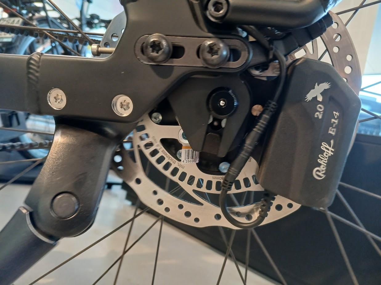 Looks like a QR, but I’d add an adapter like Burley Hitch Adapter to offset the hitch, since the E-14 box is usually wider than the dropout. With the adapter it might also be easier to reach the cable connector to disconnect, depending on the hitch used.