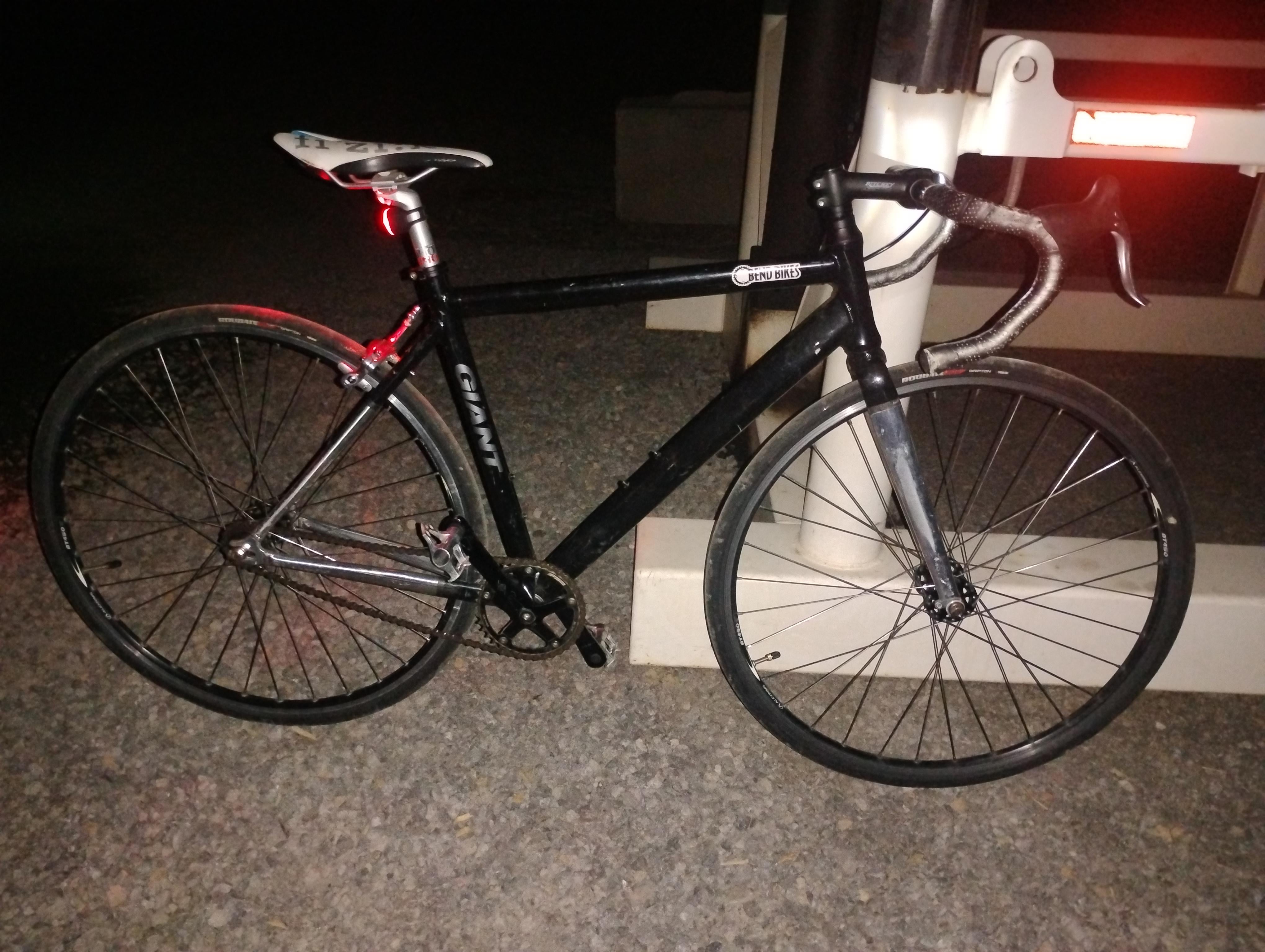 Got this Giant Bowery track bike for $25 at a local thrift store. Love it, plans are repeater style brake handles and a front brake, bar wrap, tires, and I want a larger front chainring, I want to go from a 36t to a 50t, the rear freewheel and fixed cig are 18t
