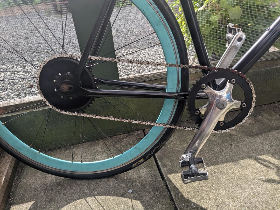 This wheel was made about 13 years ago for a fixed wheelie event it's just a old sprocket off a motorized bicycle kit welded to the original fixed cog