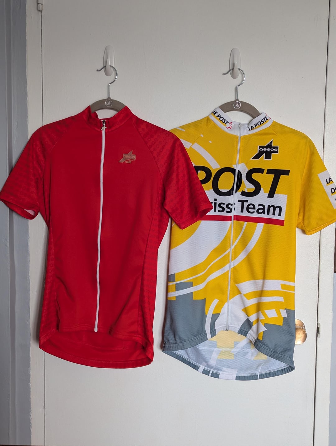 Facebook Twitter LinkedIn Pinterest Bluesky Threads Got these from a bike flea market a few months ago and I like them very much. In like new condition with little wear. They are both 100% polyester and made in Switzerland. Anyone know what year they might be from? by arc88 Bicycling Biking Cycling Cycling Fashion Fashion