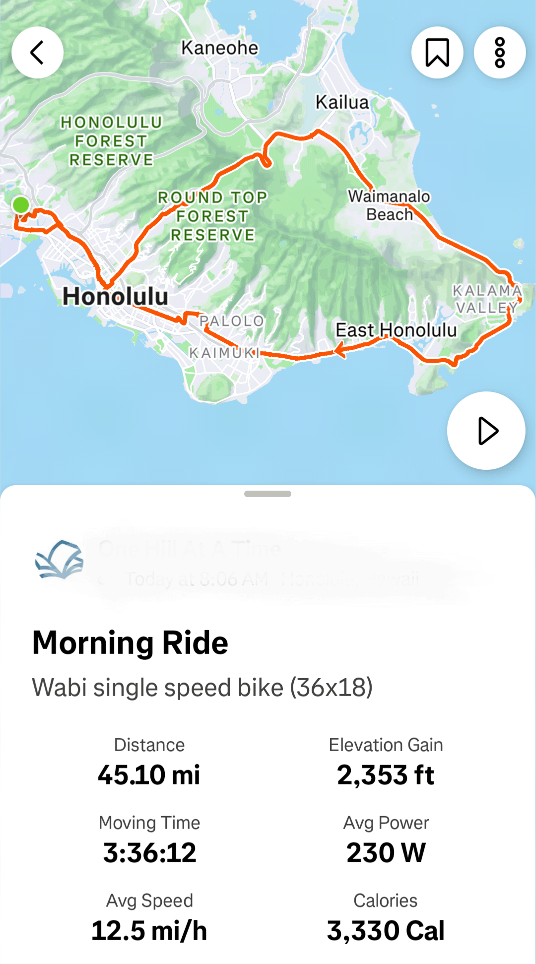 Finally tried the SE Oahu loop on my Wabi Thunder (36×18). There’s a nearly five mile, 1,000 foot climb near the start that had me reconsidering the ride, but it was worth it three hours later.
