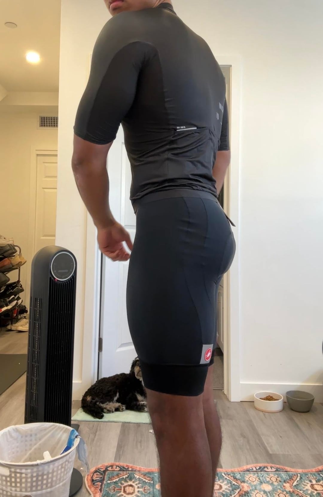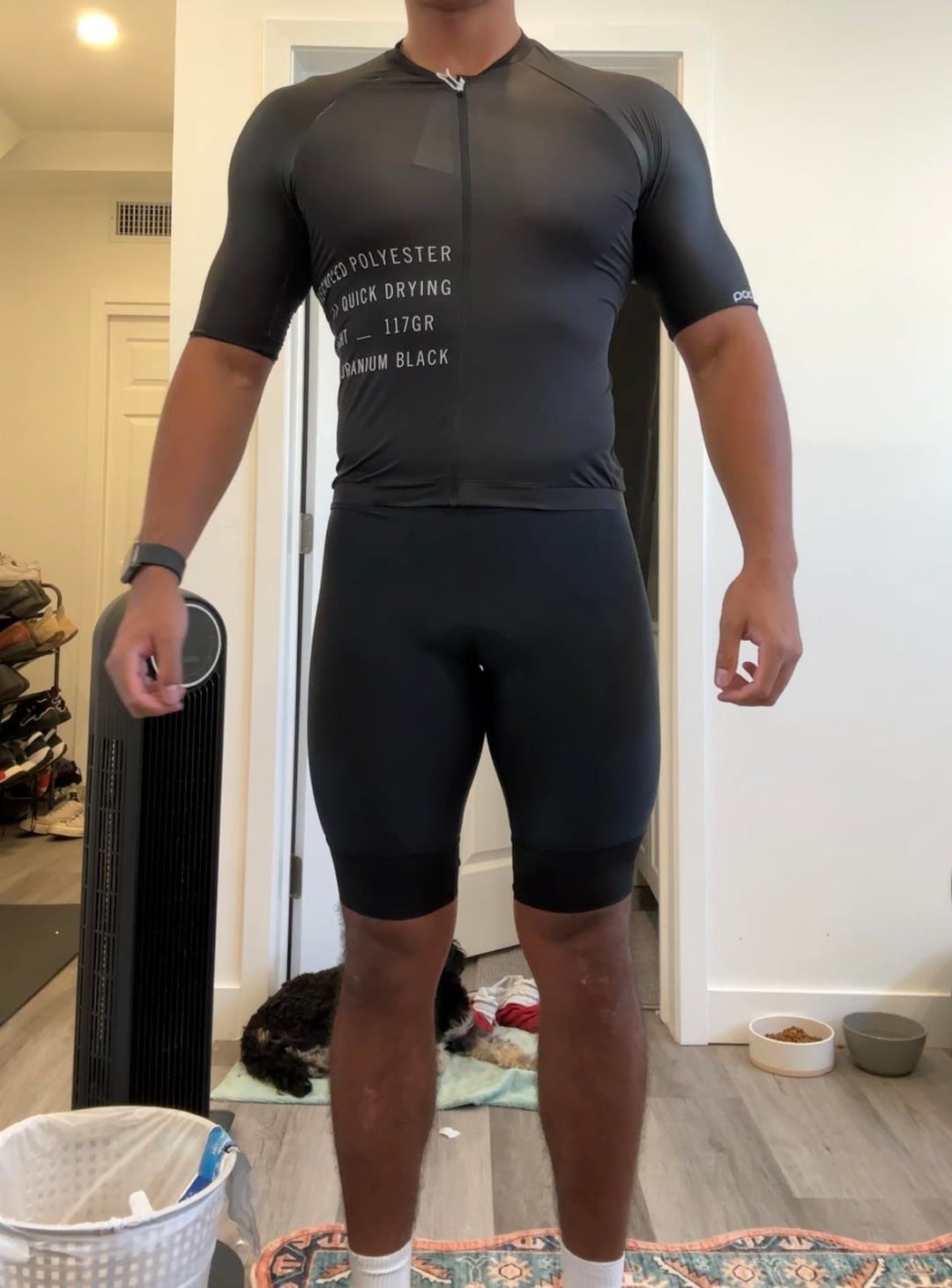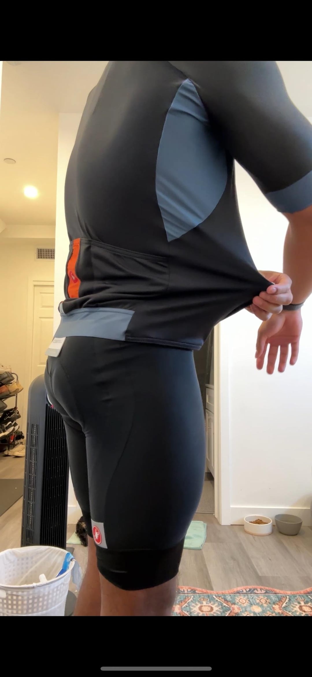 3. The Castelli is too loose on the torso, but it looks great on the shoulders, so going down to L might be too tight on the shoulders. Your best bet might be to take the XL to your tailor to have the sides taken in a bit for perfect fit; not an expensive alteration, maybe $20. POC is race fit but fits well (although for me, I don’t like how front is cut so short).