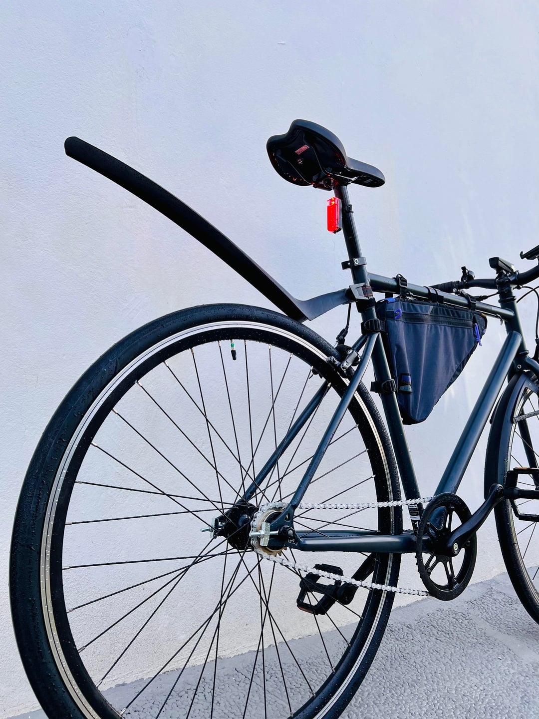 3. Rear mudguard is intended to strap to your seatpost so it sits close to the rear wheel and follows its curve