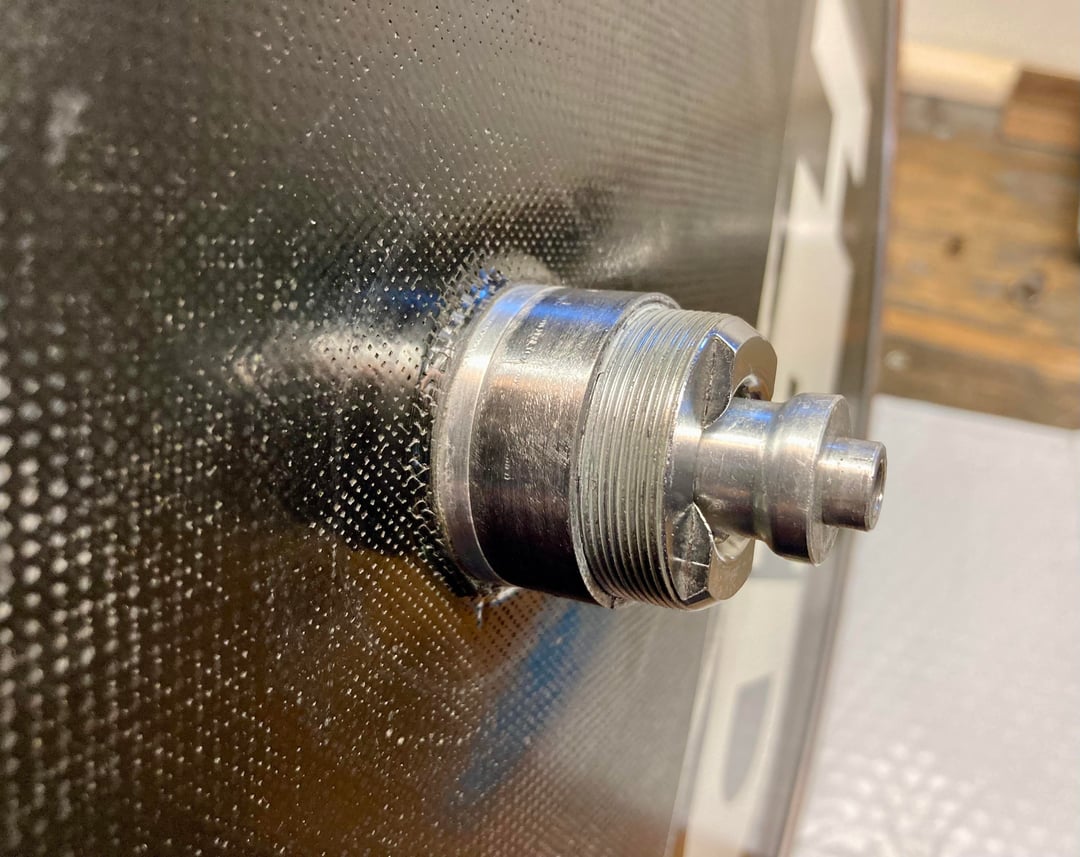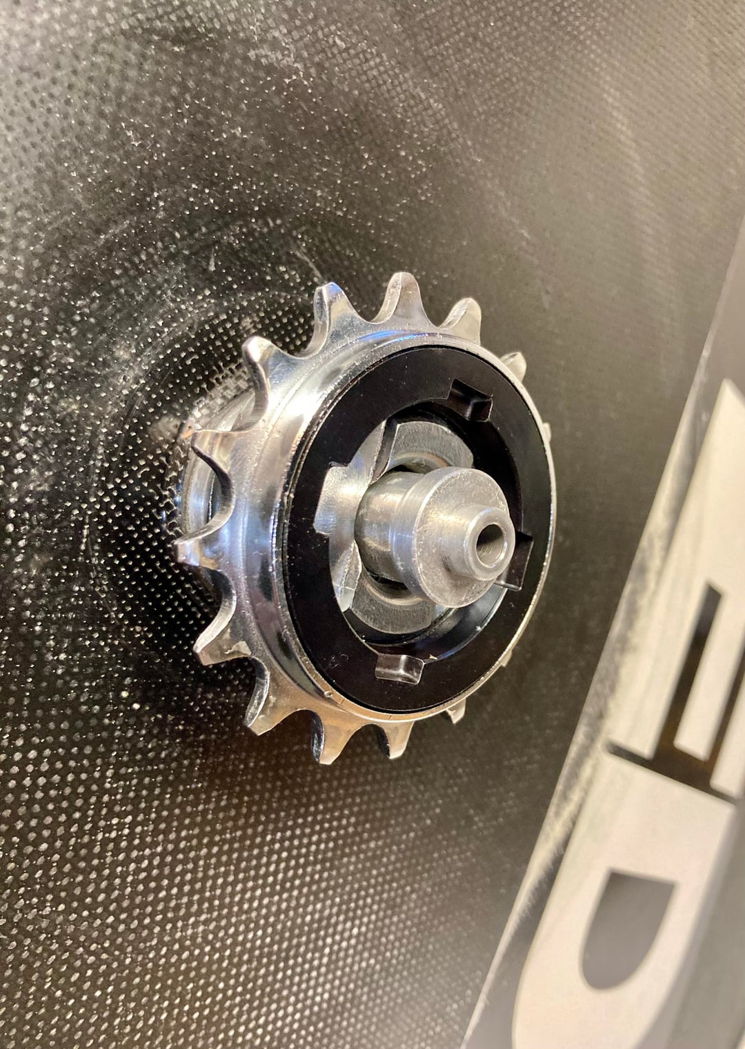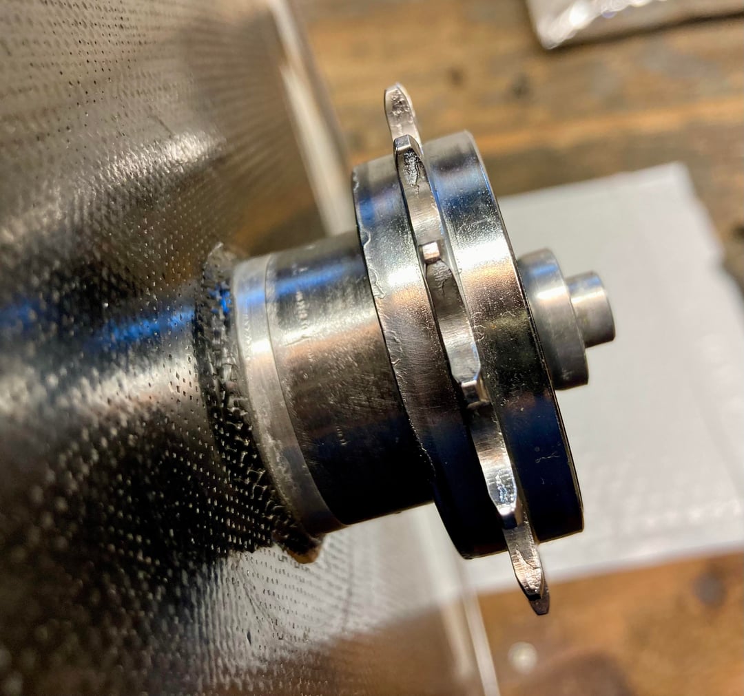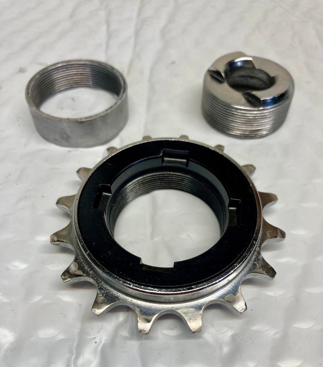 I’ve had a little time to come up with a more elegant solution than a reconfigured 7 speed freewheel. This time I cut the non drive side threaded section off a bottom bracket shell for use as a coupler. Inside that goes a non drive side cup from a three piece square taper bottom bracket. It all threads together and aligns the chain line properly. The non drive side cup from a sealed square taper bottom bracket may be used as well. This solution works on wheels like this which you cannot adjust for dish, as you could with a standard spoked wheel.
