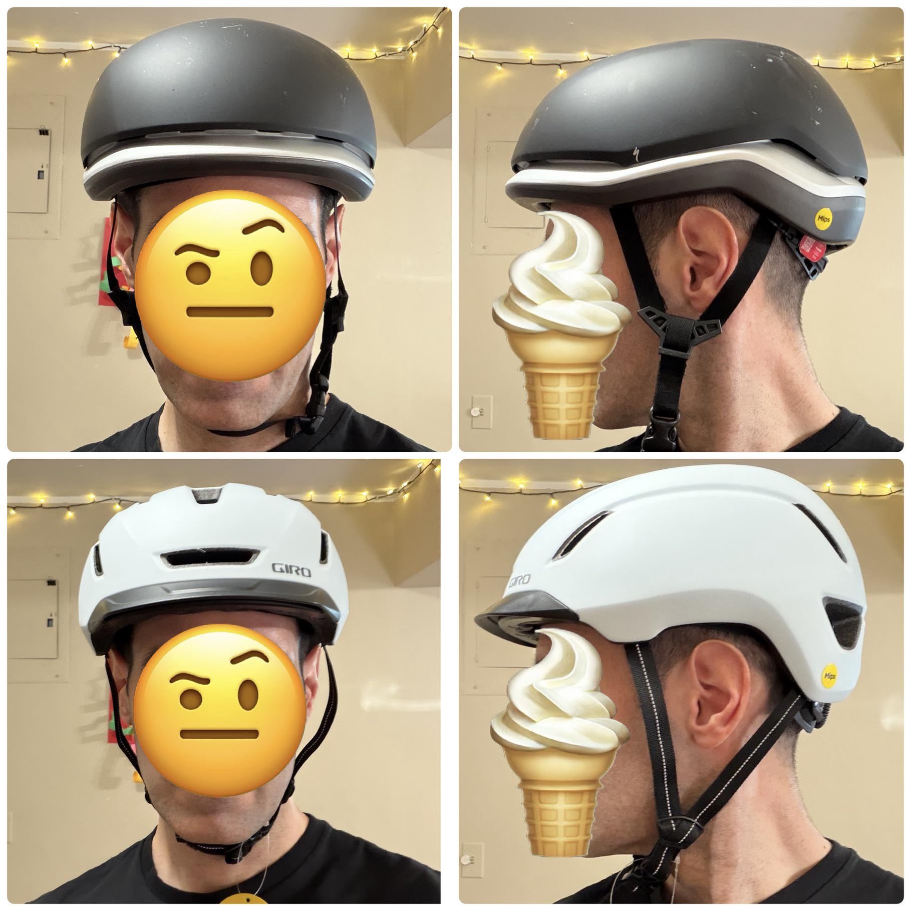 Specialized road helmets fit me perfectly, but unfortunately Specialized doesn’t make attractive commuter helmets. Top photos are the Specialized Mode, in size M, which looks very mushroomy on me.