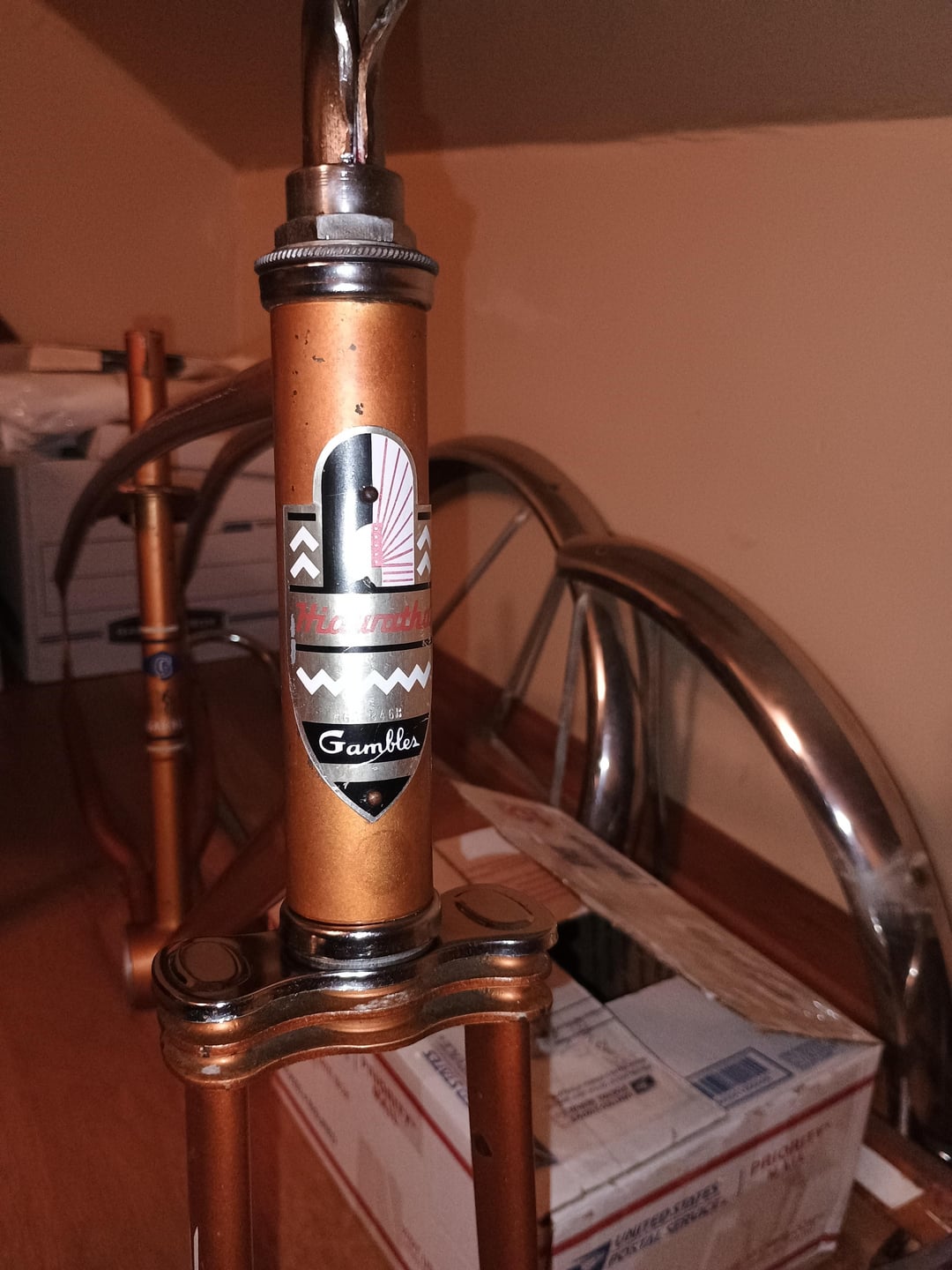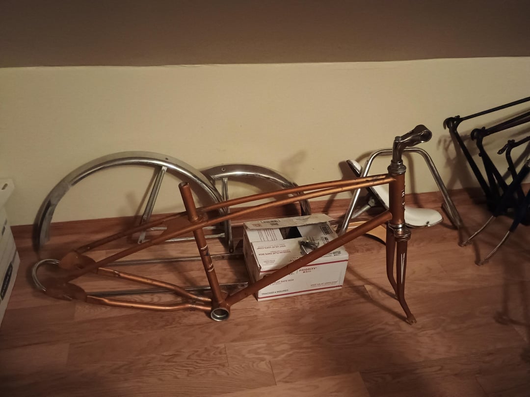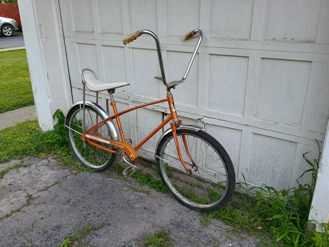 It's got a Bendix RB2 hub, and the pedals look pre-70s to me (?), nothing else that indicates much more than broadly 60s/70s.. The wheels take 24×1.75 tires, had a "Tractor Grip" which looked original and a Cheng Shin from unknown
