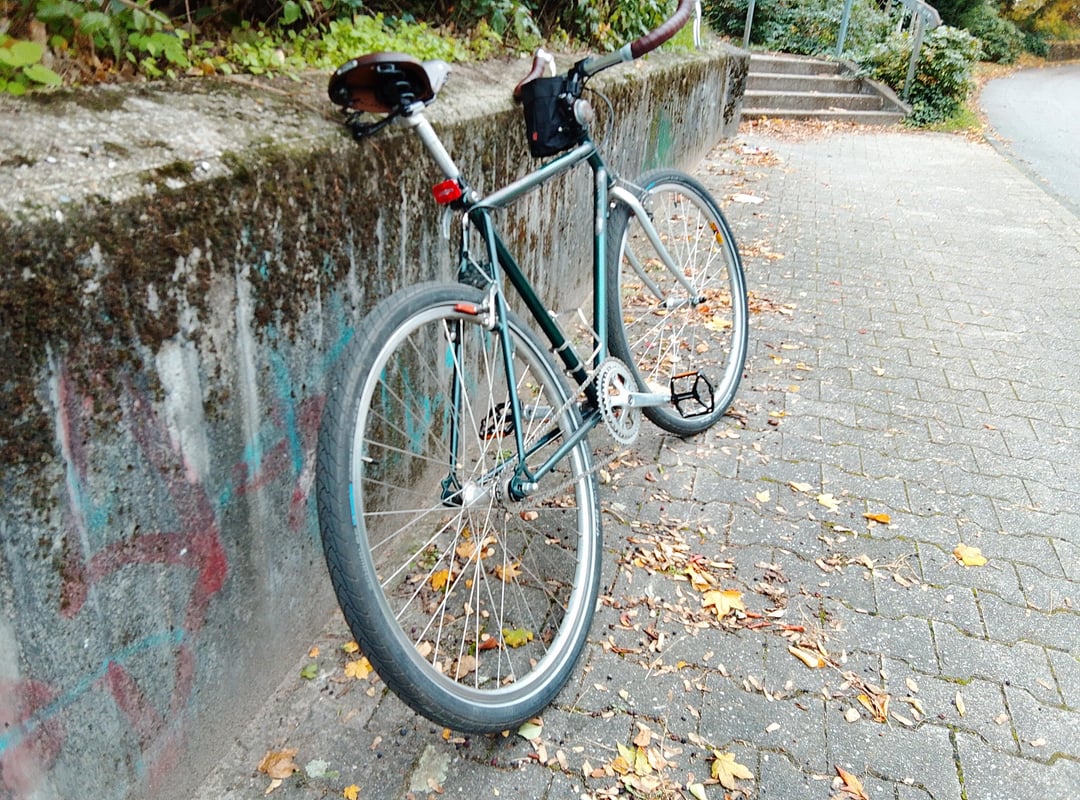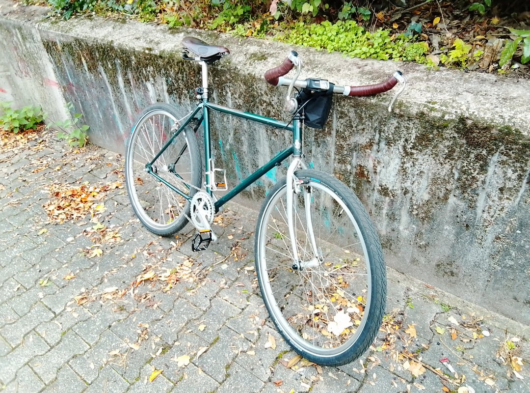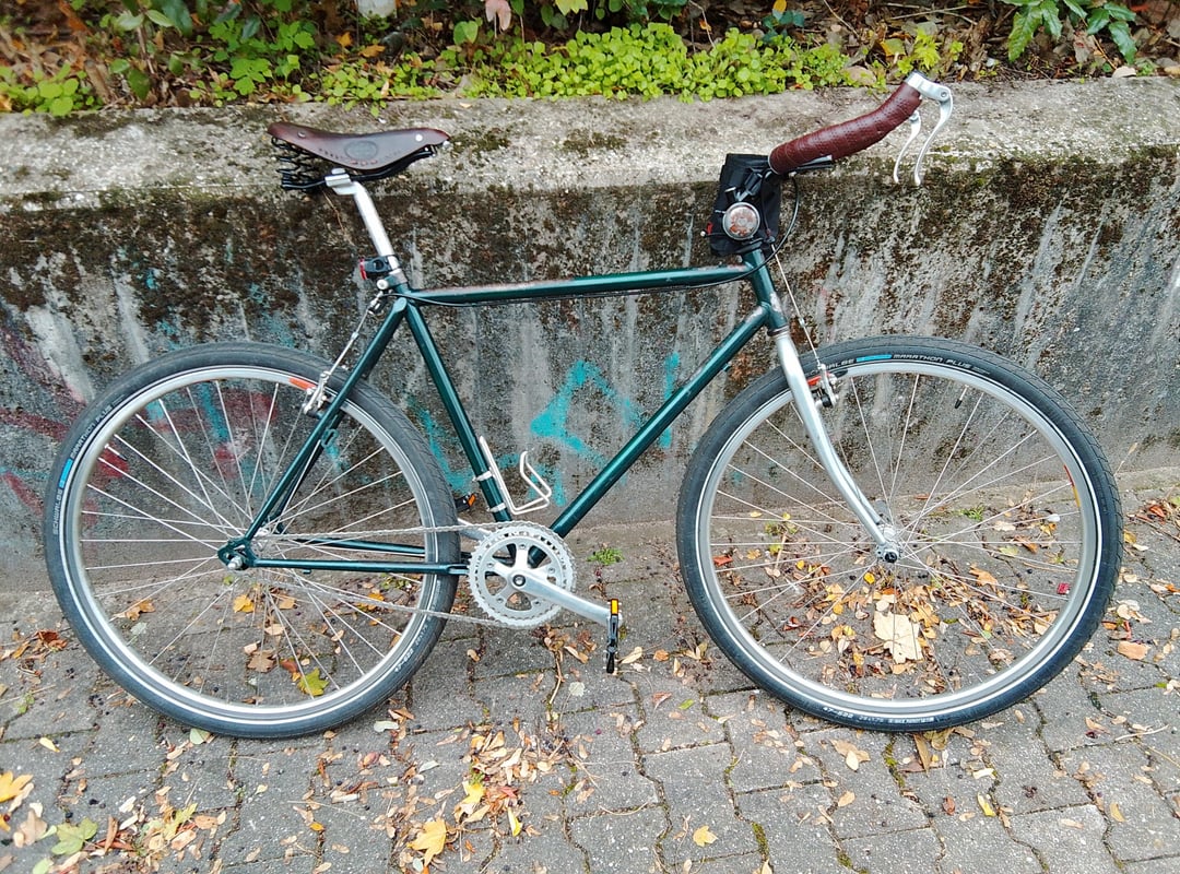Born as a Trekkingbike in the 90s, branded as "Patagonia Trekking Line" made in Germany, bought for 50€ at a fleamarket. Now it's my daily beater and main method of transportation. Frame and fork made of steel, weelsets, seatpost, cantis and the bell still original. Crank is a Shimano FC-MT60 (110BCD, 170mm, 3x), tires are Schwalbe Marathon Plus 47-622, gearing is 46/17. Small chainring up front is only temporarely in place 'cause I didn't had short screws at hand. Will switch to a 1x/2x Road-Crank with 130BCD and a shorter BB in the near future, but everything else is pretty much set.
