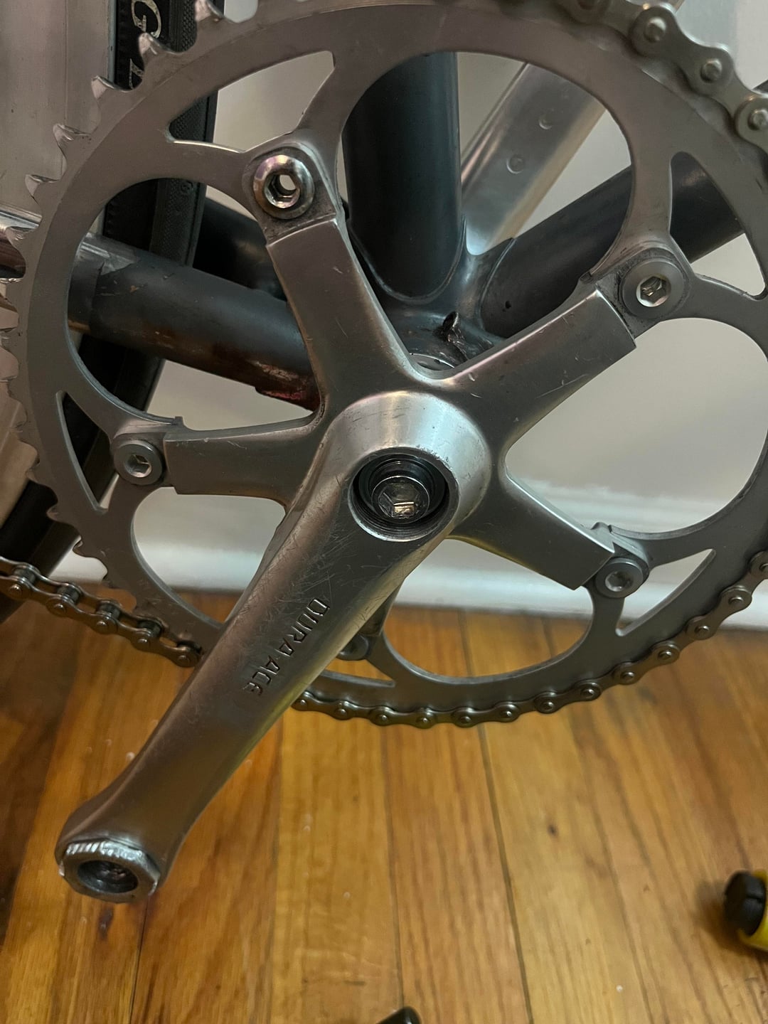 I have a Miyata from the 80s that I just bought that came with Dura Ace Dyna Drive cranks and while peddling I felt the drive side pedal give. I immediately got off and went home and the threads were as good as stripped from the deformation of the metal. So I tried to remove the Dyna drive adapter that lets you use 9/16 pedals. With my full strength on the wrench the metal on the adapter deformed, and the huge sudden release of tension sent the wrench straight into my forehead. Now I’ve got a headache and I can’t even swap out the cranks on my bike because I’ve found that the threading for where the crank puller goes has been stripped. So I can’t use my bike until the automotive gear puller that I’ve been forced to order arrives and I can pull the drive side crank off of the bottom bracket spindle. So here’s my rant about Dyna Drive and soft metal.