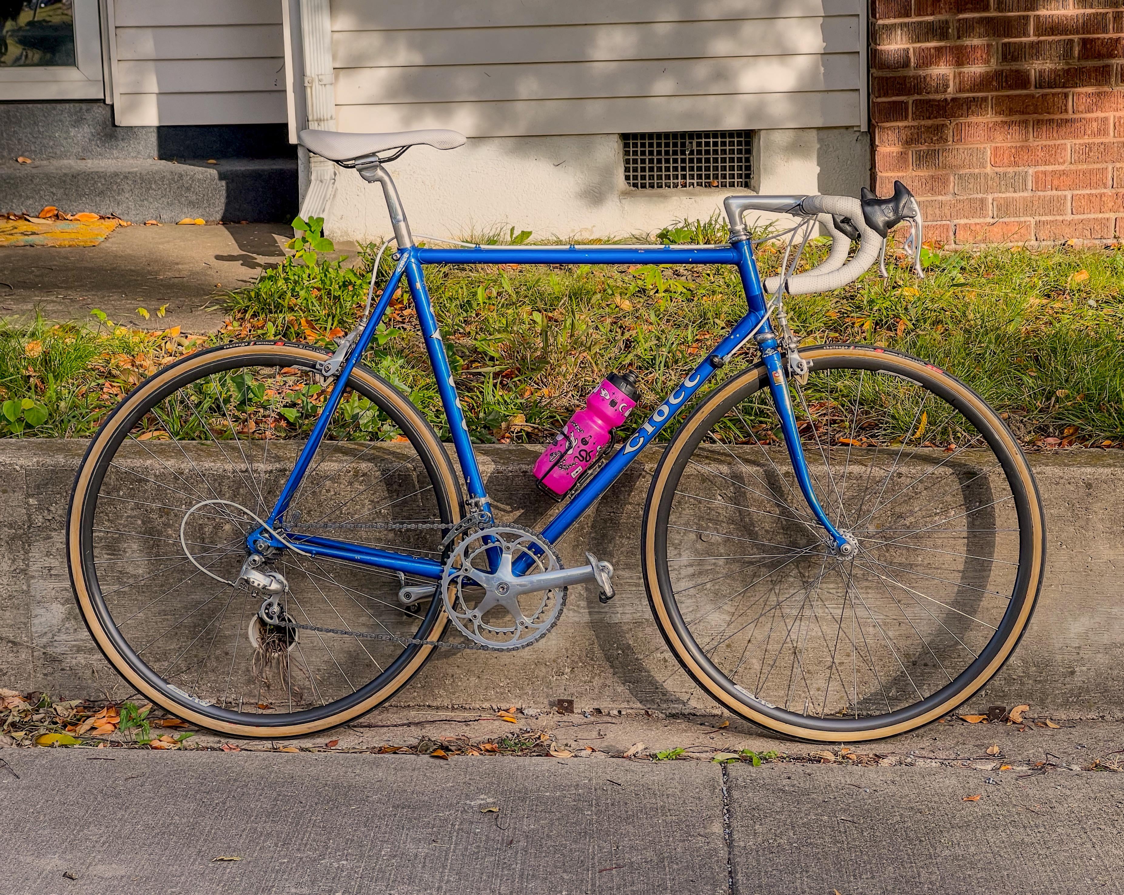 I posted this with Shamals a while back, but these have always been the intended wheels – 8-speed Record hubs laced to tubular Seoul 88 rims. The build is a mix of 8-speed Campy stuff. Record ti shifters, a late 8-speed Record rear derailleur, and C-Record cranks. The brakes are Chorus Monoplanars, and the front derailleur is older Super Record, because it was the only clamp-on Campy option in my parts bin. First shakedown ride was today, and I’m a fan.