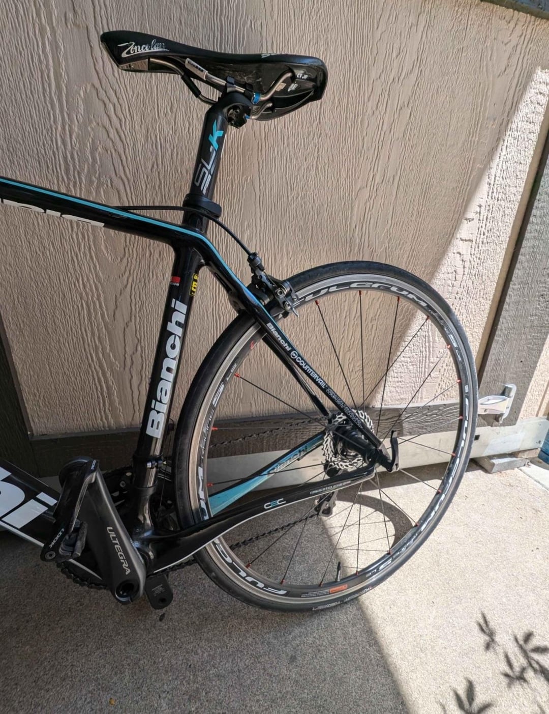 I had a 2016 Bianchi Intenso Veloce (10 sp Campag). That’s the nonCV version of this bike, with a lesser group set than this. The rim brakes were fine in my area of short, steep hills . But, I didn’t ride it in the rain. That frame is fantastic and without disc brakes it’s lighter in weight. Make sure you’re OK with the gearing. Mine was a 50-34, paired with an 11-27 cassette, which isn’t low enough for me to climb for hours