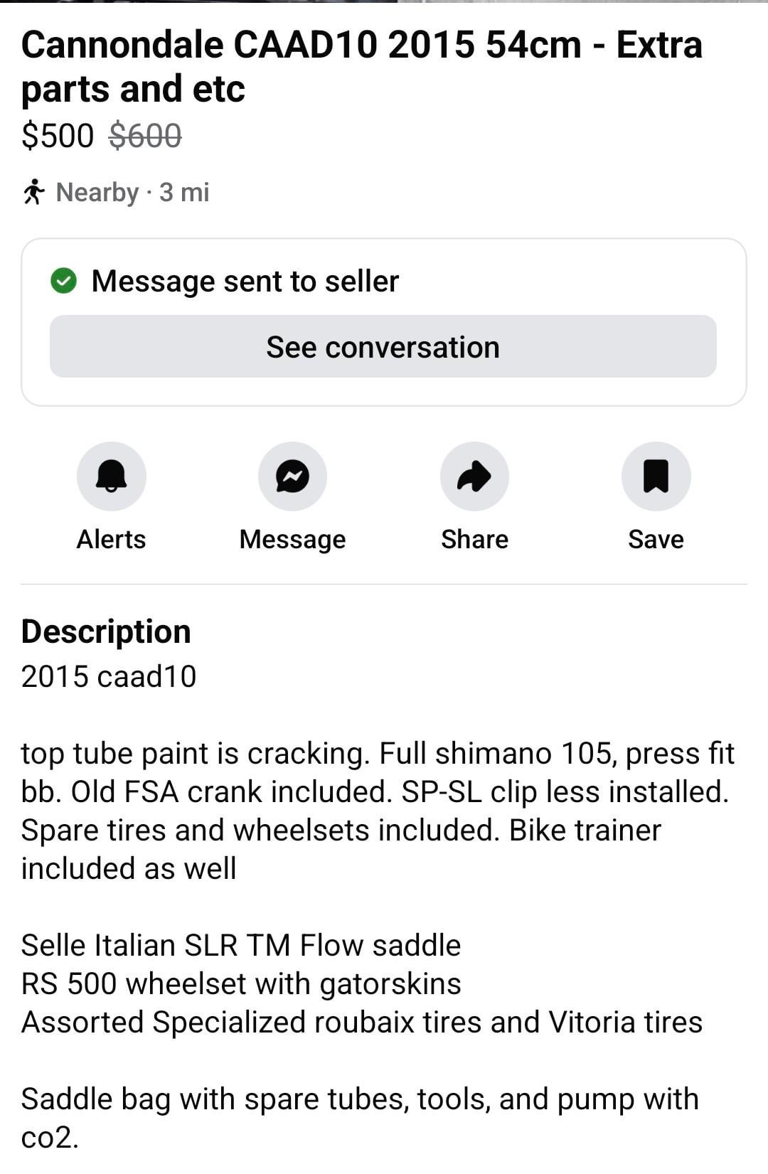 Not a bad price given how prices are higher in the SF Bay Area. The extra wheels don’t add much value since they are pretty old and mismatched. I’d offer $400 or wait for something in better condition to come along. It will most likely need some work to get running given it’s sat long and was probably on a trainer for a while before then.