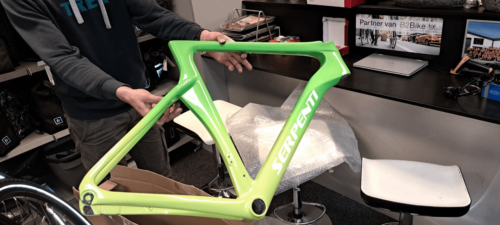 Mandibles in green weave. You’re going to have black on your bike (I’m assuming) once you add your cockpit, wheels, post, saddle etc. The black from the cage will complement those compound and the green accent will look nice with the frame.