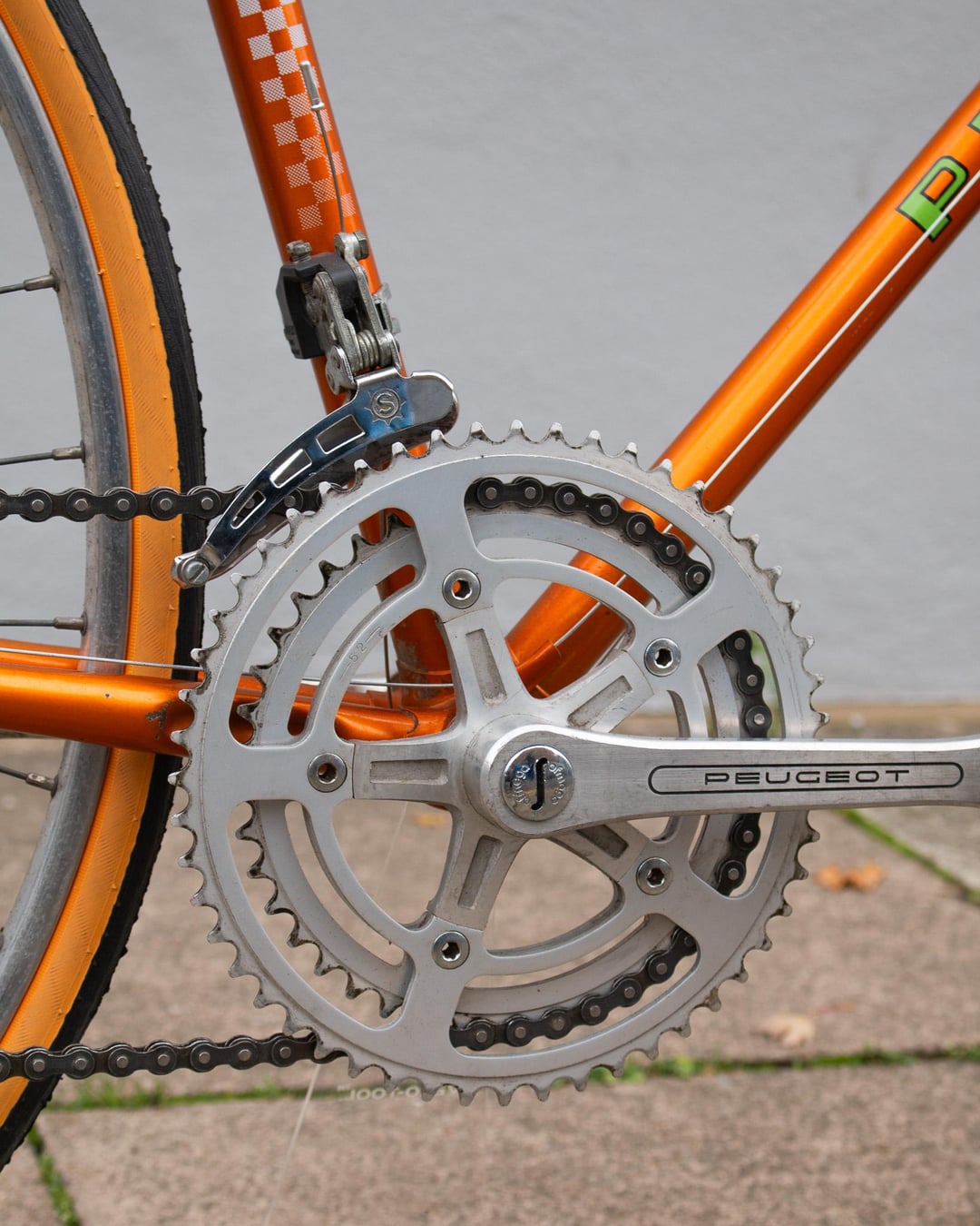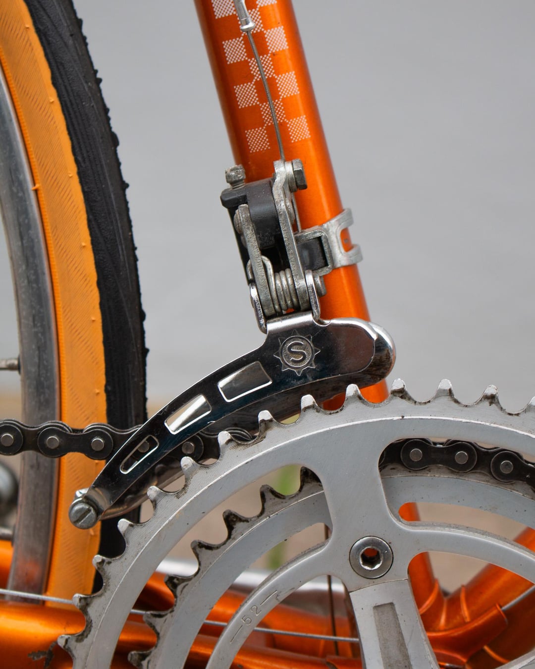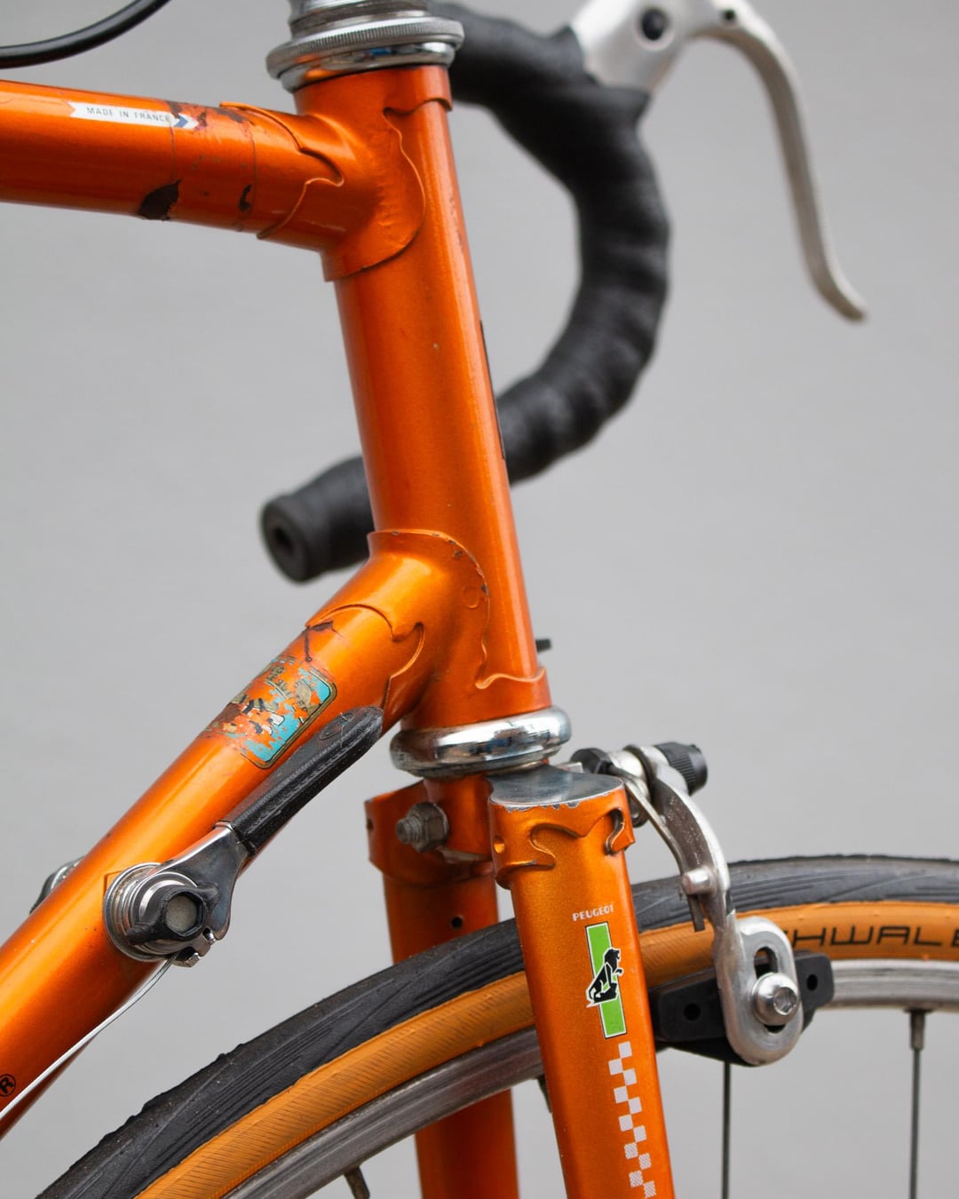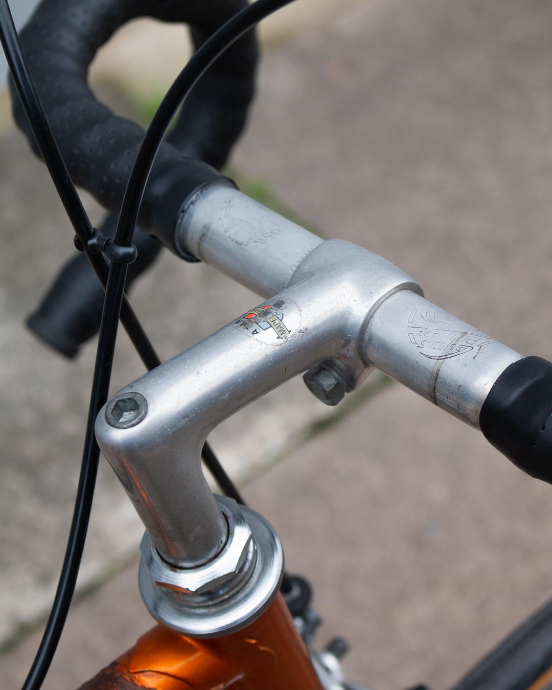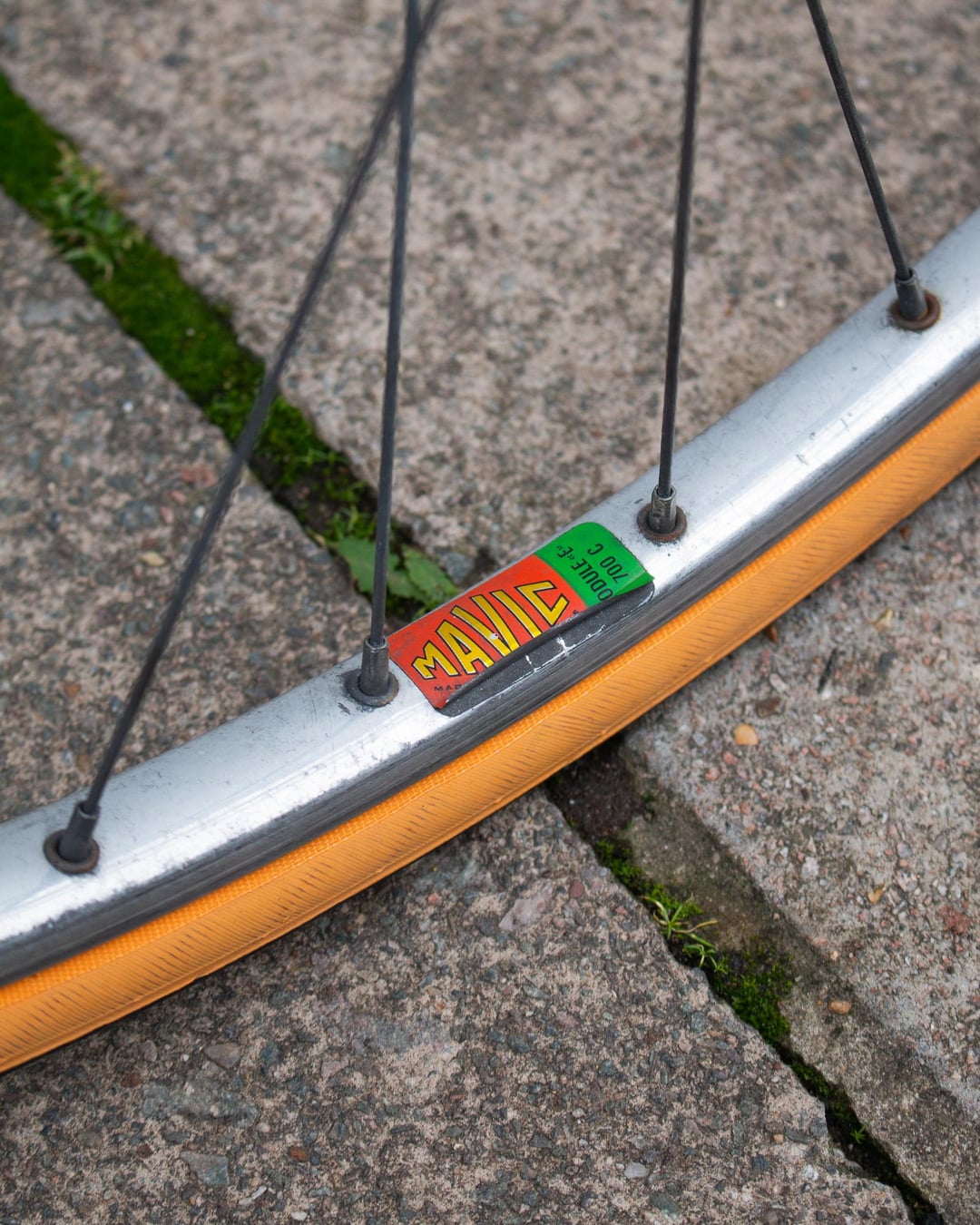 It features all the classic French components from that era, Simplex derailleurs, Peugeot crankset, Mavic rims on Axom hubs, Atax stem, Philipe handlebars, Stronglight headset and bottom bracket and Weinmann brakes. It even has original Sedis chain and Maillard freewheel. Seatpost, saddle and brake levers are not original.