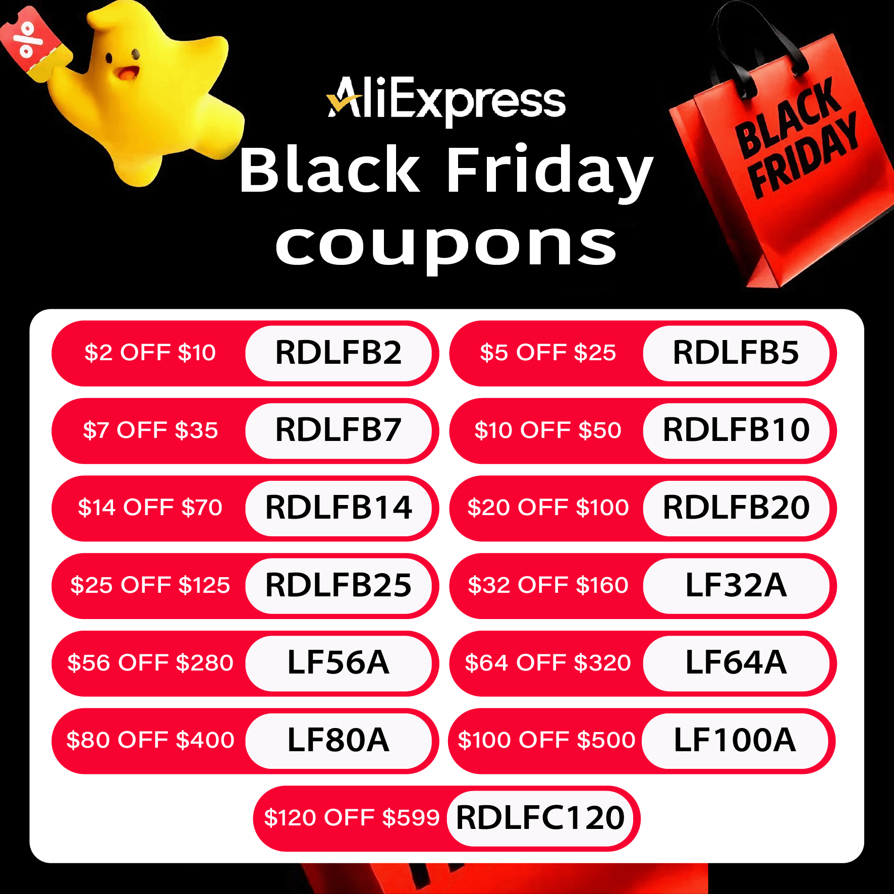 Codes (US only · 11/8–12/30): $2 off $10:RDLFB2 $5 off $25:RDLFB5 $7 off $35:RDLFB7 $10 off $50:RDLFB10 $14 off $70:RDLFB14 $20 off $100:RDLFB20 $25 off $125:RDLFB25 $32 off $160:LF32A $56 off $280:LF56A $64 off $320:LF64A $80 off $400:LF80A $100 off $500:LF100A $120 off $599:RDLFC120