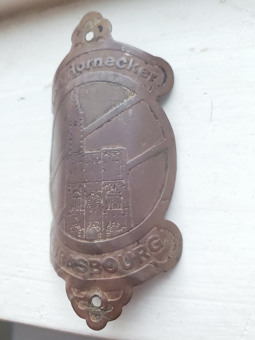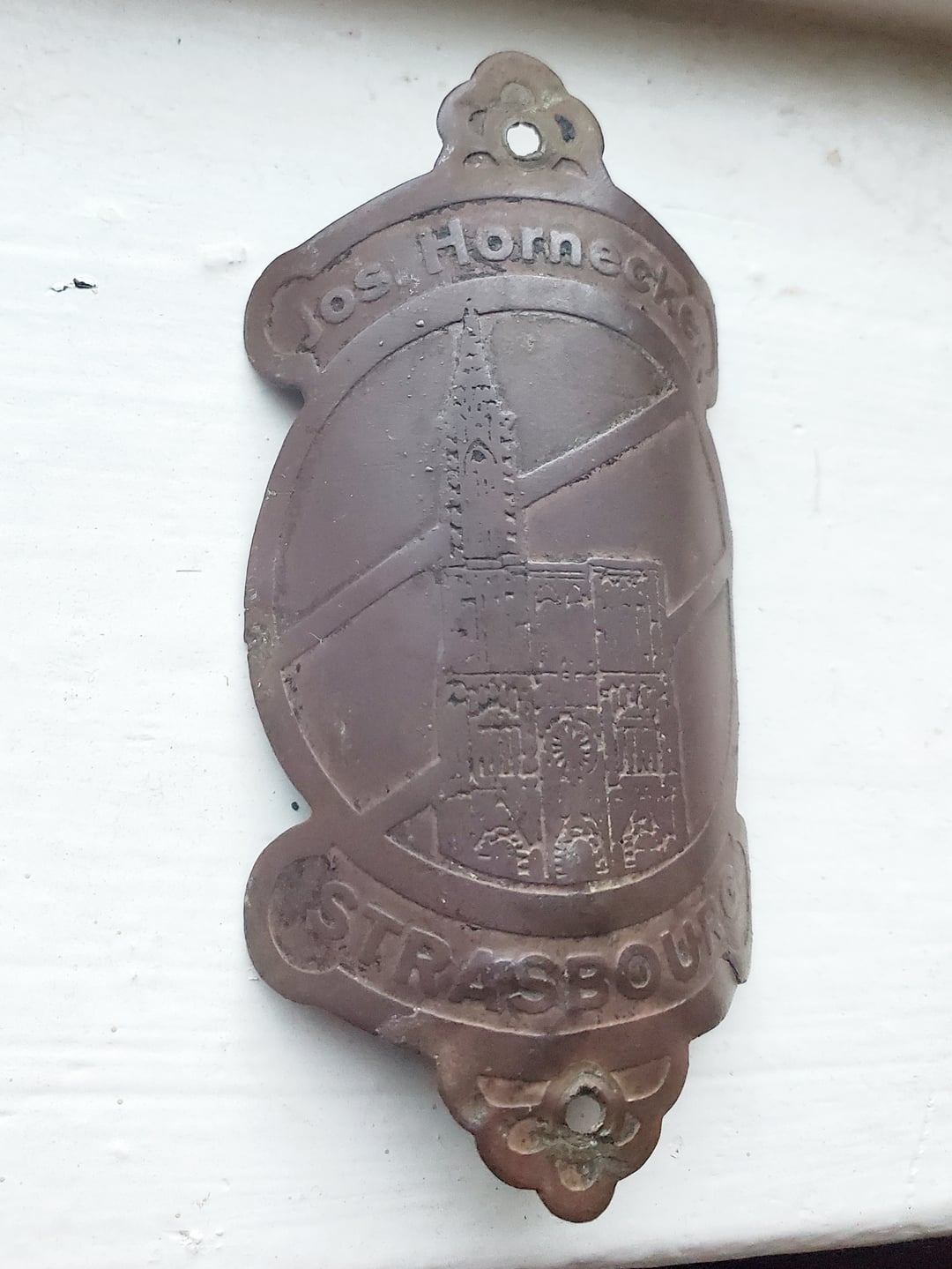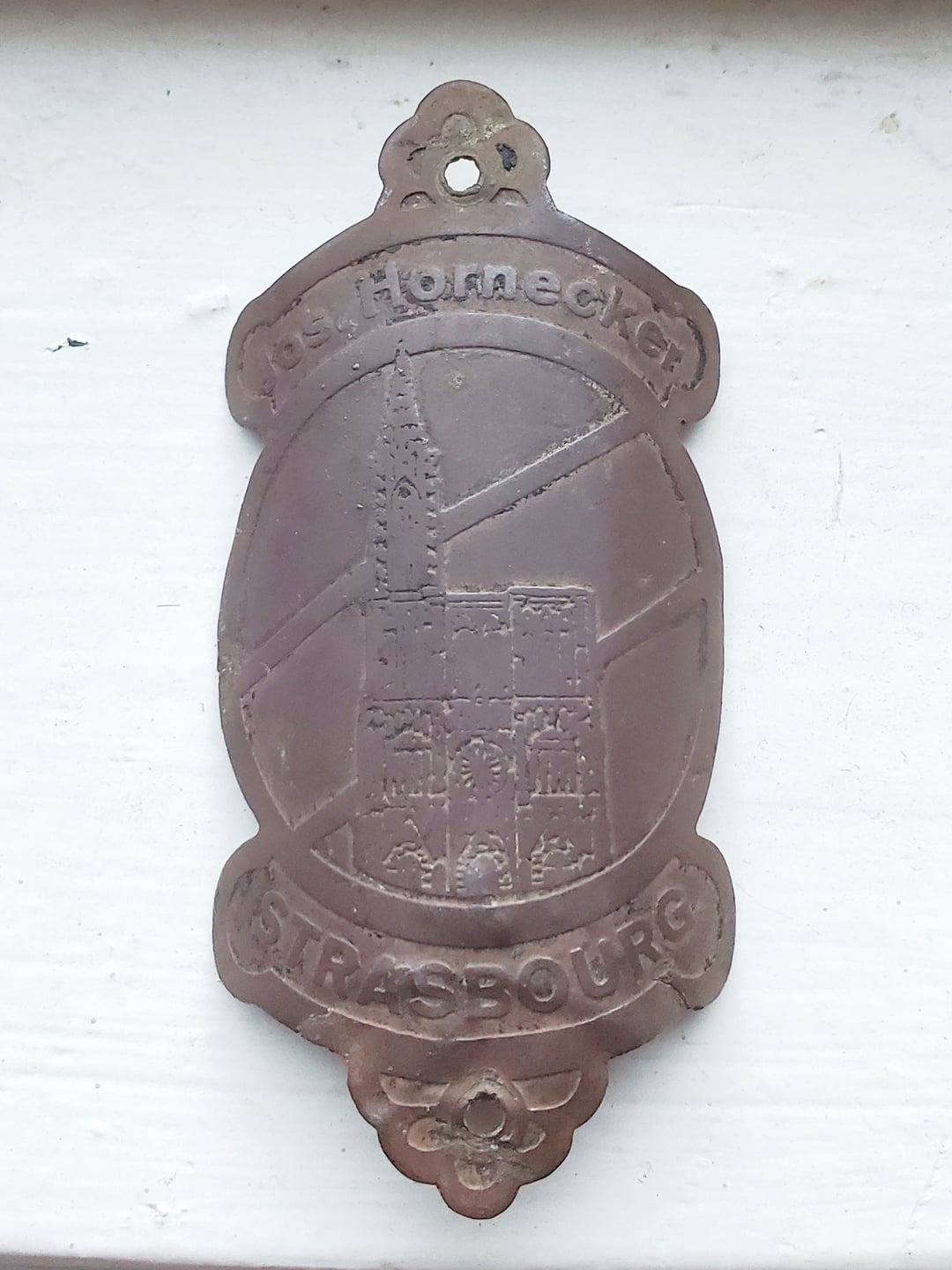 The text on the emblem reads "Jos. Hornecker" at the top and "STRASBOURG" at the bottom, with an illustration of the Strasbourg Cathedral in the center.