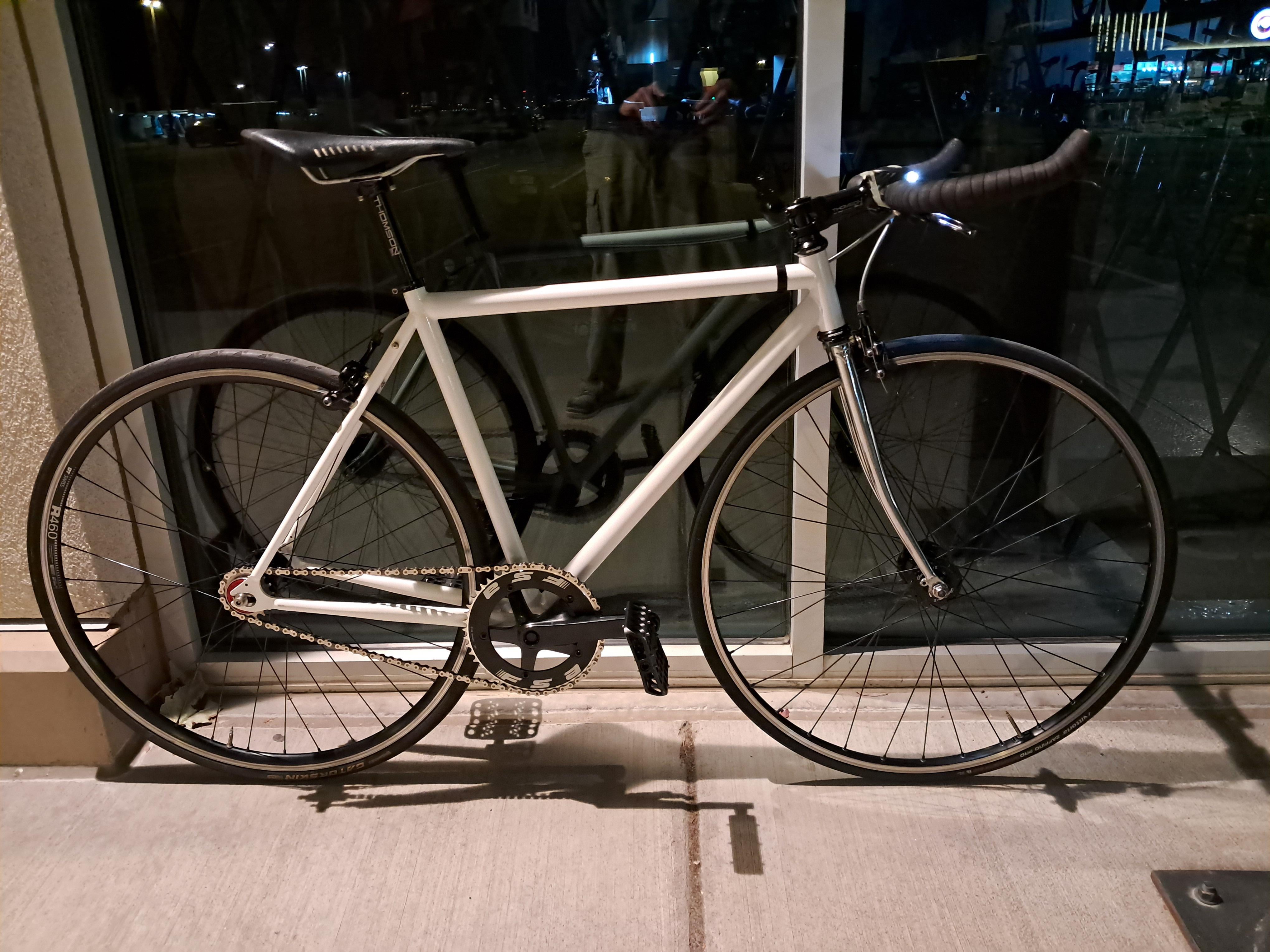 It's a mix of things from marketplace, ebay, local co-op parts bins, etc… still a work in progress but it's been a joy to learn the build process and to ride! by RightTimeWrongGear Bicycle Bike Fixed Gear Fixed Gear Bicycle Fixed Gear Bike Single Speed Cycles