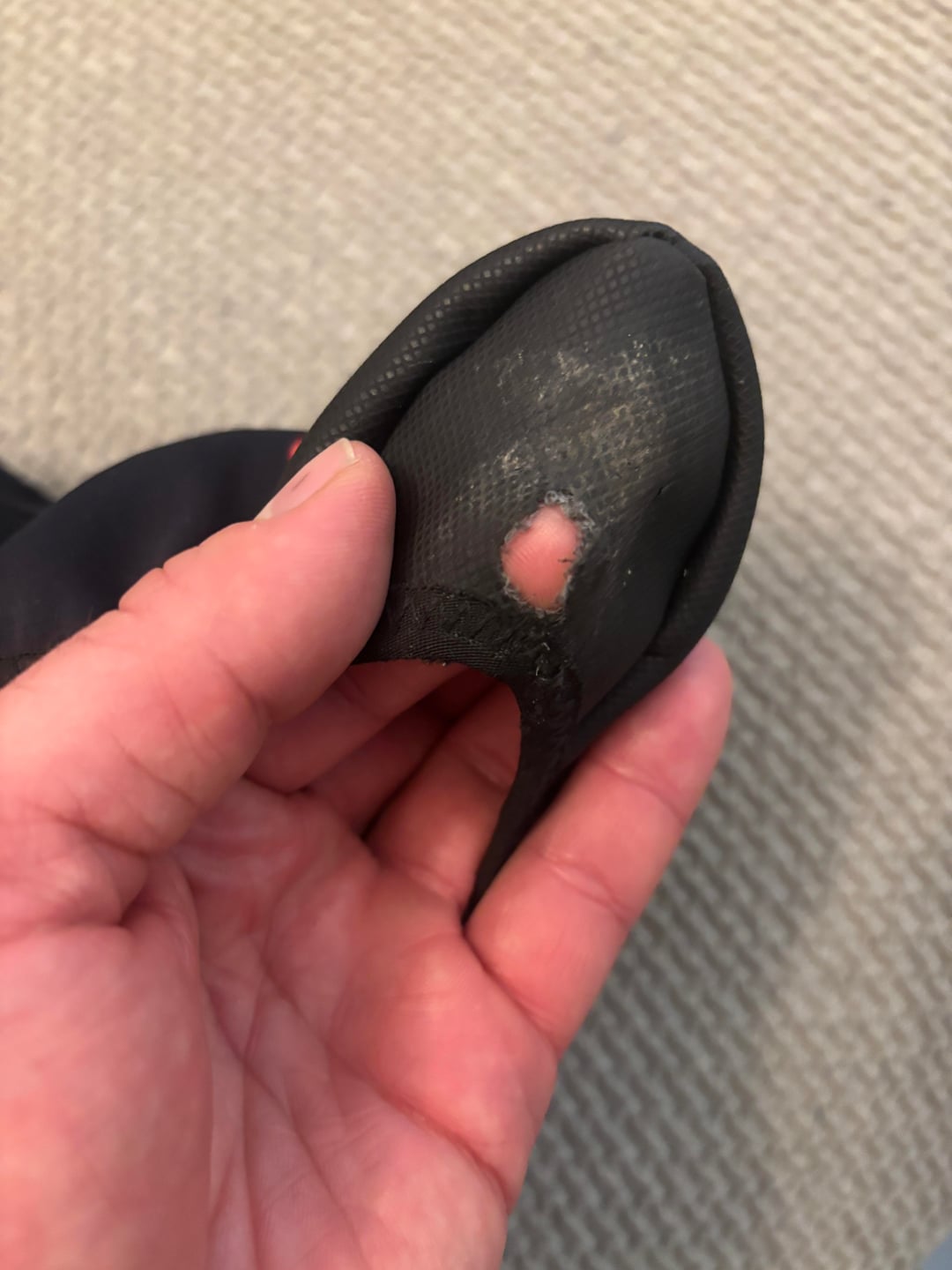Hi everyone! The shoecover is quite new. I used it maybe 5 times and after today’s ride I discovered this hole on the left pair. I’m guessing it’s how I clip in or I don’t know. I’m new at cycling and clipping in isn’t always so smooth 🙂