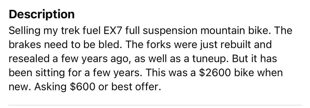 The Trek Fuel EX7 ($500) is the one I’m leaning towards, though it looks like it needs a bit more initial maintenance. I’m trying to identify its year as well—any ideas?