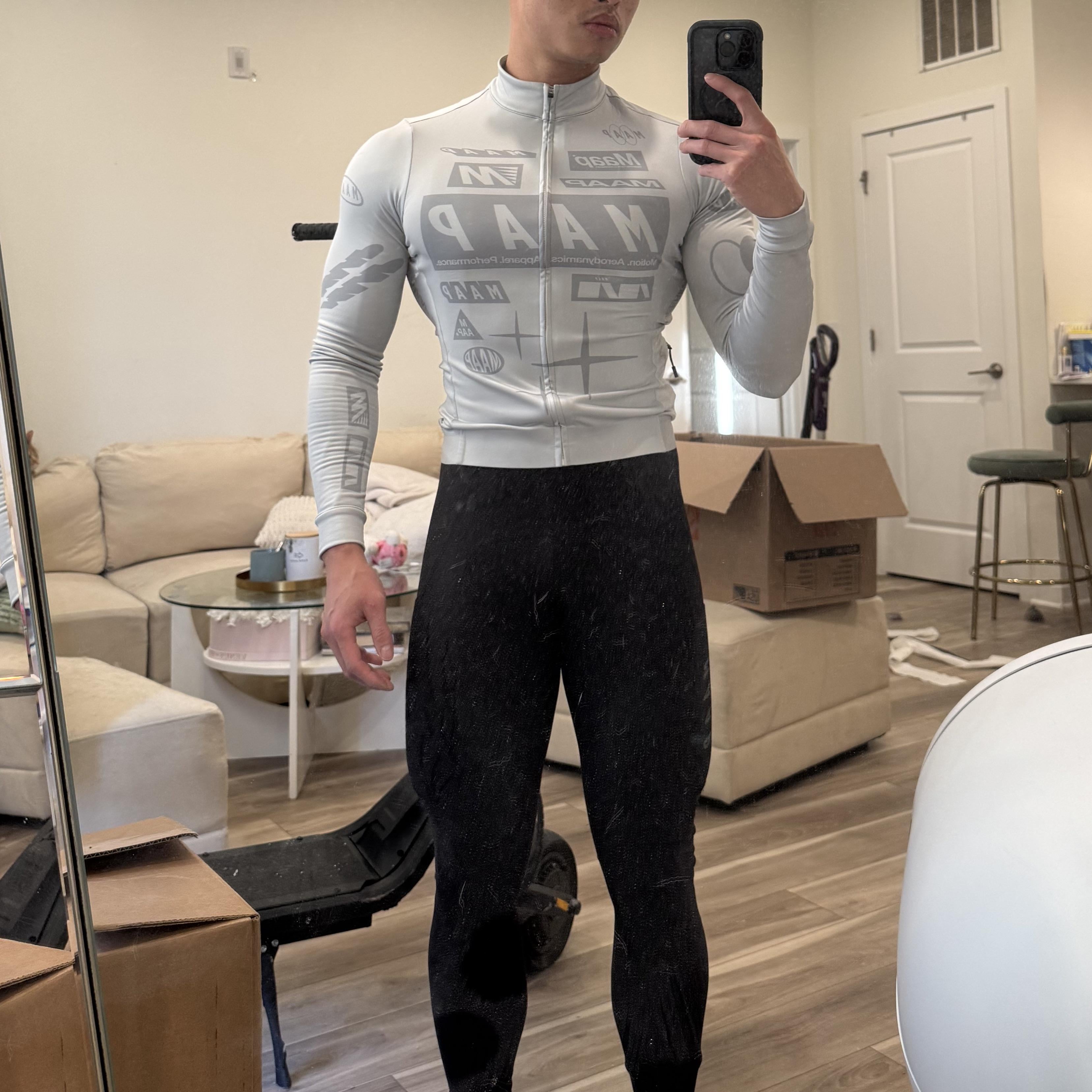 With your physique the bottoms look petty good but you might struggle with MAAP jerseys since they tend to be designed for a narrower chest overall. You might want to look for jerseys with a club fit or classic fit. Pearl Izumi makes jerseys to this end. Canyon also sells classic fit jerseys. If you’re set on MAAP then I’d point you toward their training jerseys which should have a more accommodating fit.
