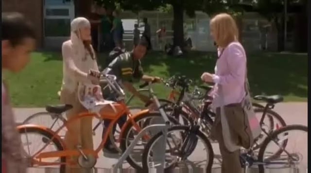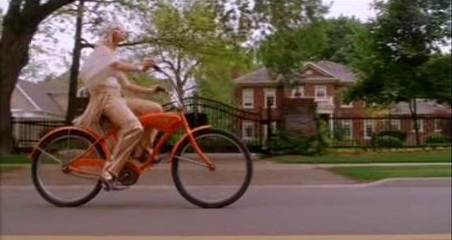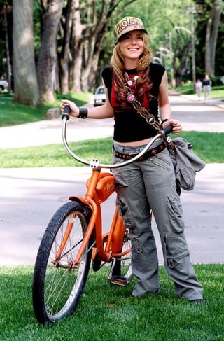 i always found lindsay lohans bike from the movie so cool growing up. the bright orange, the swooping body and just how chill she looked riding it. anyone got info on it? the handle bars look so uncomfortable though. she even holds it at the tips from time to time