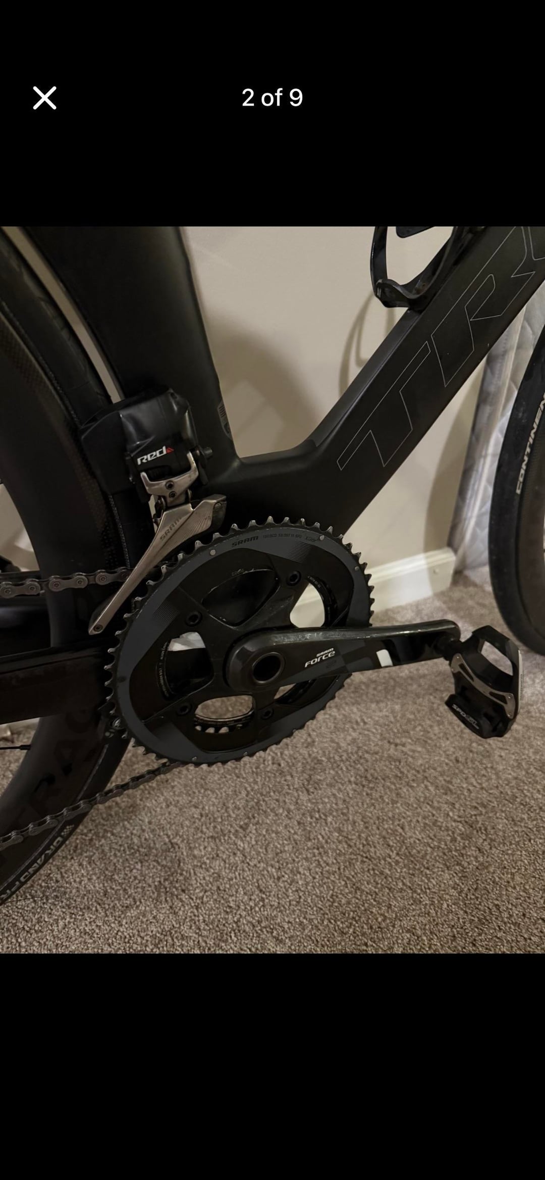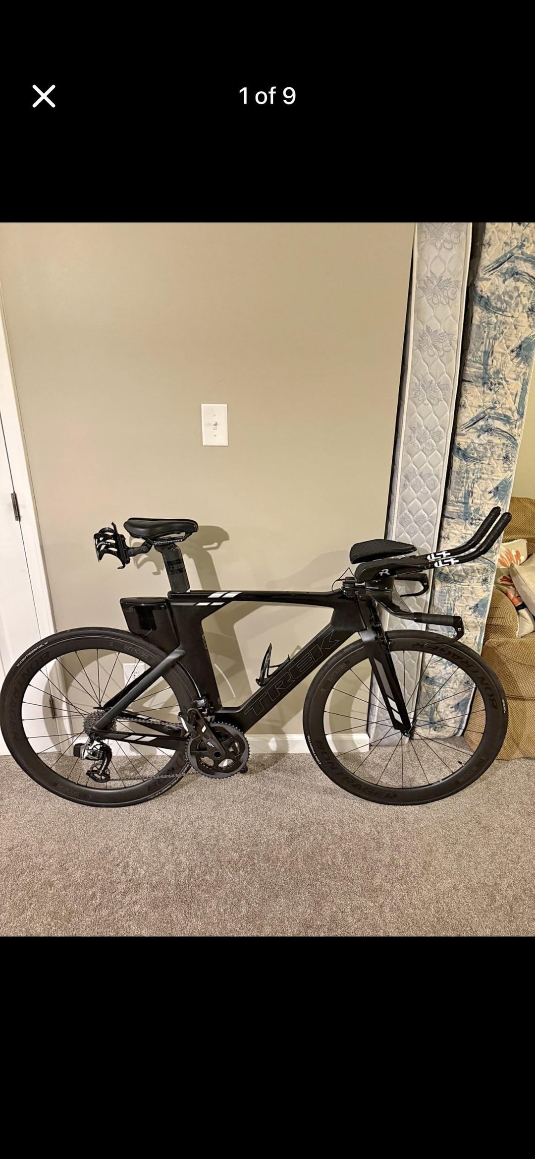 Trek Speed Concept in size Large. Equipped with a SRAM Force crank, Stages power meter and wireless SRAM Red electronic shifting. Features a BiSaddle for excellent fit and adjustability, comfortable TriRig arm cups, and new tape up front. Wheels are the stock Aeolus Pro 5s, currently wrapped in Continental GP5s.