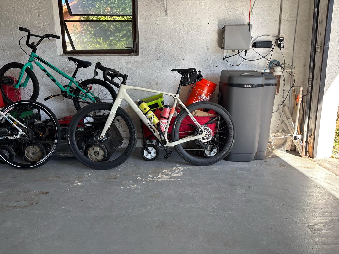 I have stone walls and exposed beam ceilings, so I didn’t want to drill anything, so I ended up getting the Topeak Dual Touch for… I think about €130, and have 2 carbon bikes on it. I wanted something that kept them out of the way as much as possible, so I set it up in a corner behind a door