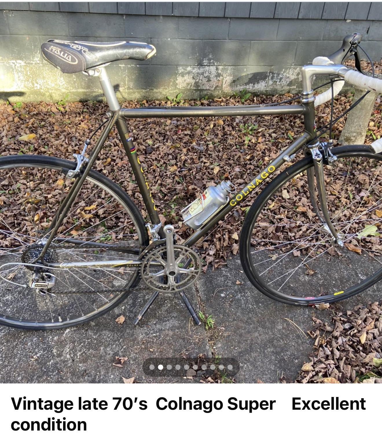Description reads – “Your viewing a Vintage late 70’s Colnago Super very clean with some light patina. Columbus SL Chrome Moly Steel. Mechanically excellent, Dura Ace rear derailleur, Shimano 8 speed STI shifters. New rare Hatta Swan headset. All quality components. Selle saddle. See pics. All new cables, chain and head set. Size is 56cm. From top of seat tube to center of cranks. Hard to explain how nice this bike is. Bike shop tuned”. (Dont know anything about these bikes it’s listed for 600 so pls give your thoughts)