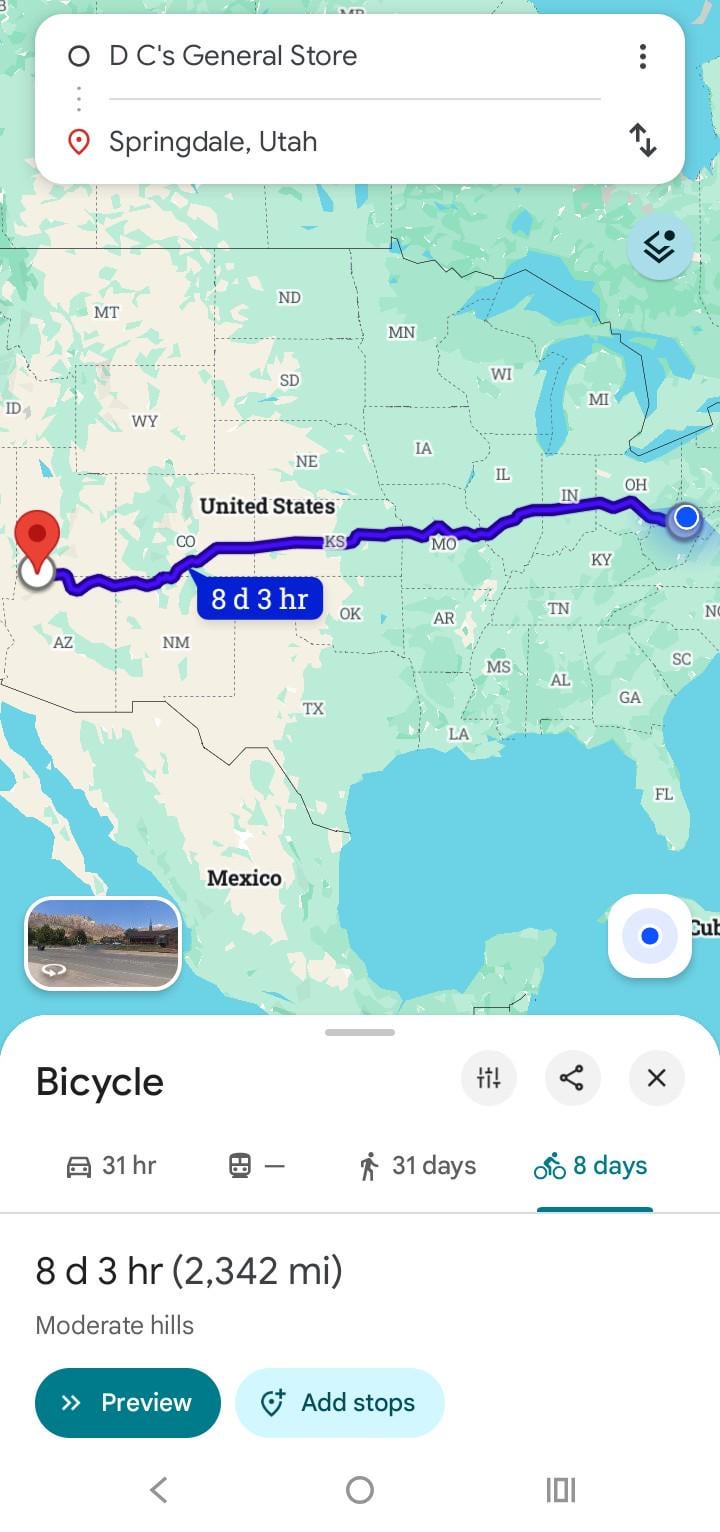 EDIT: also Google’s estimate is for riding 24/7. If you average 75 miles per day, this ~2,100 mile trip will take you a full month at an absolute minimum.