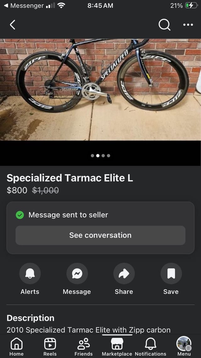 – 2010 Specialized Tarmac Elite: "With Zipp carbon wheels and shimano ultegra pedals. Outstanding condition, annual maintenance, and low usage"
