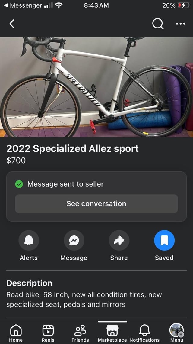 -2022 Specialized Allez Sport: "Road Bike, 58 inch, new all condition tires, new specialized seat, pedals, and mirrors"