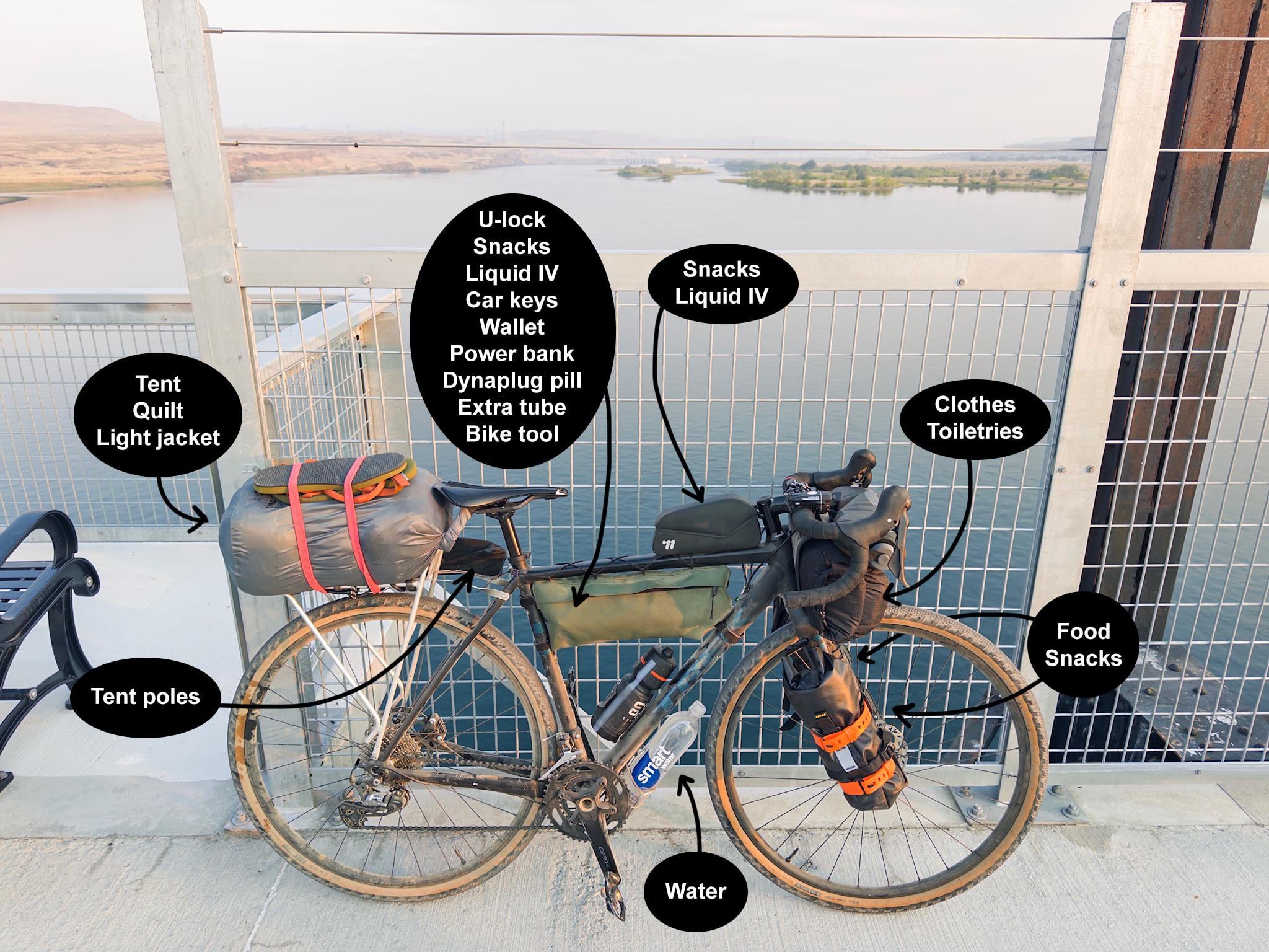 I like to separate out the things I won’t need until setting camp in the evening and the things I might want during the day, then I have bags that are easy to access and bags that are inconvenient. Frame bag, top tube bag are examples of easy to access, and snacks or extra clothing layers or tools go there. I also think you’ve got space to stick a dedicated tool roll or wallet under the saddle without hitting that drybag.