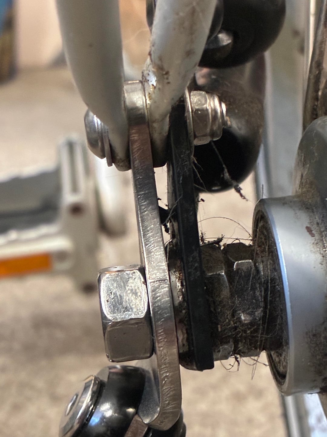 Installing some flat washers at the rear rack stays, to match the thickness of the tab “top” washer, would be a good idea, to evenly secure the kick stand plate. A longer bolt might be necessary, if washers are added.