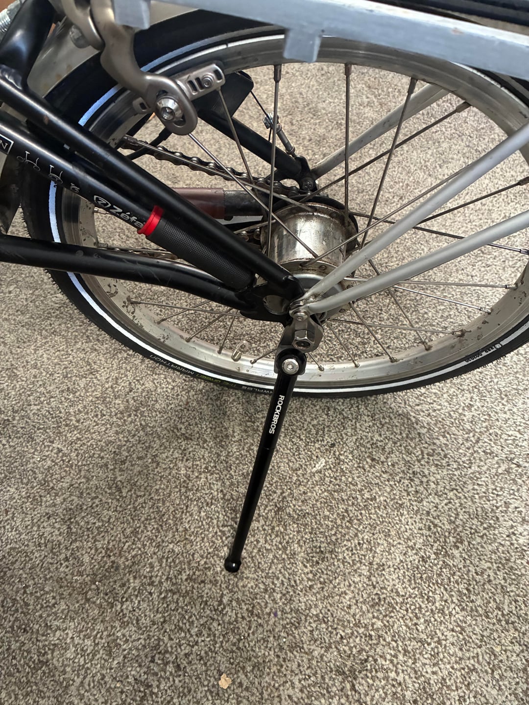 What kickstand is that? I’ve half considered doing the same (and always relating to leftover food on the rack and either taking it off or just leaning the entire bike against something)