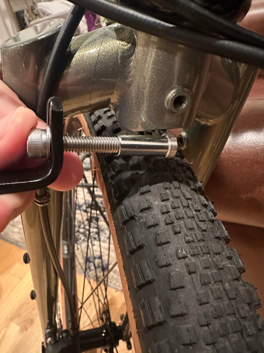 just get a long-ass M6 bolt so you can stick it through both holes. put a nut on the backside of the fork, even though that side is threaded; don’t take chances with front-end stuff.
