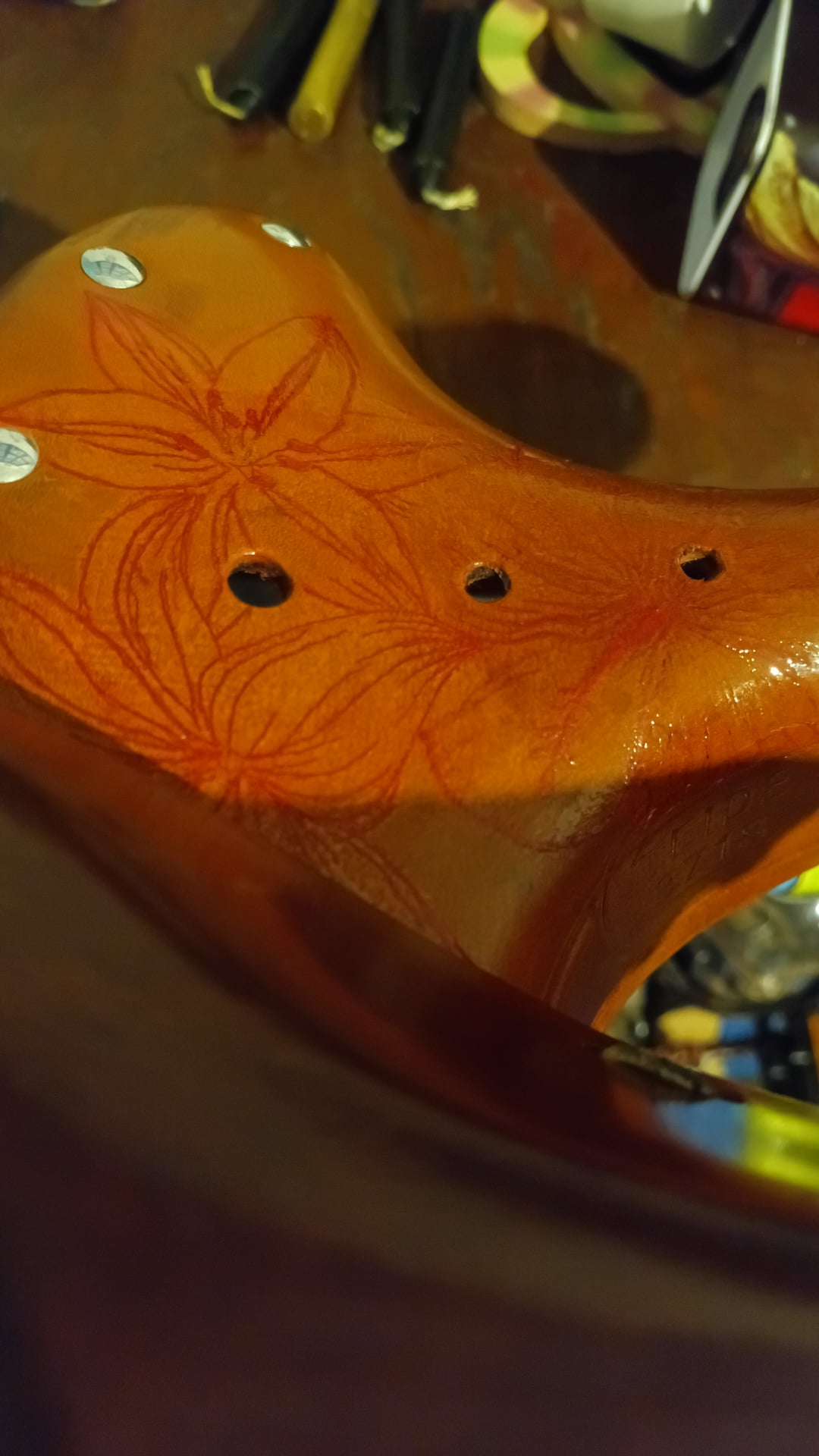 I would be really curious what a western-style leather guy could do with your pattern. Floral motifs are the bread and butter of that world. If you’re not set on having such deep relief cuts, the whole thing could be done purely with stamps. Look up “tooled leather” or “leather tooling” for some more inspo.