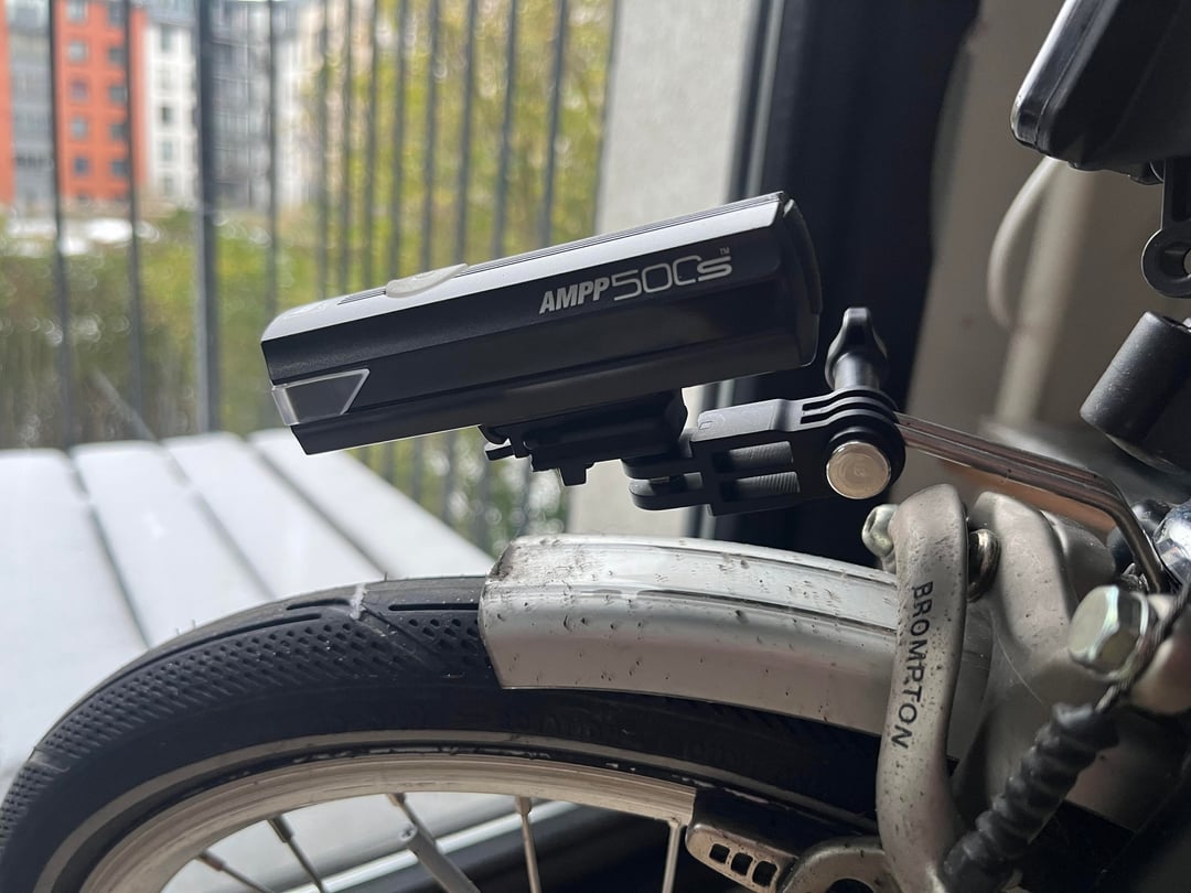 TLDR: Mounted the Cateye/Brompton Ampp500s on the dynamo light bracket using a gopro extender.