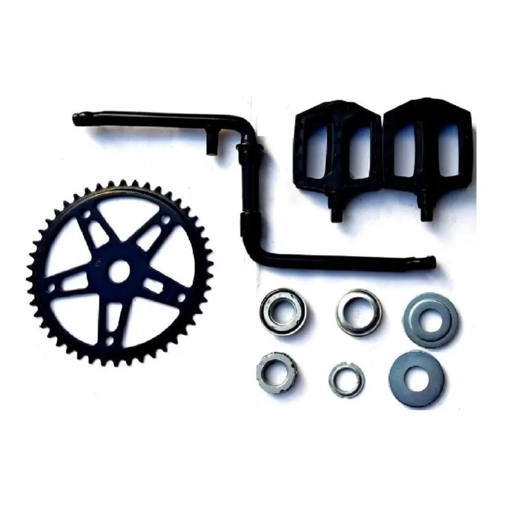 There are decent chromoly 1-piece cranks, and decent bearing sets out in the world if you look at parts for vintage BMX bikes. That said, you’ll likely be stuck with 1/2″ pedal threads (or adapters that push the pedals quite a bit further out). You might also have issues finding a decent chainring in your preferred size.