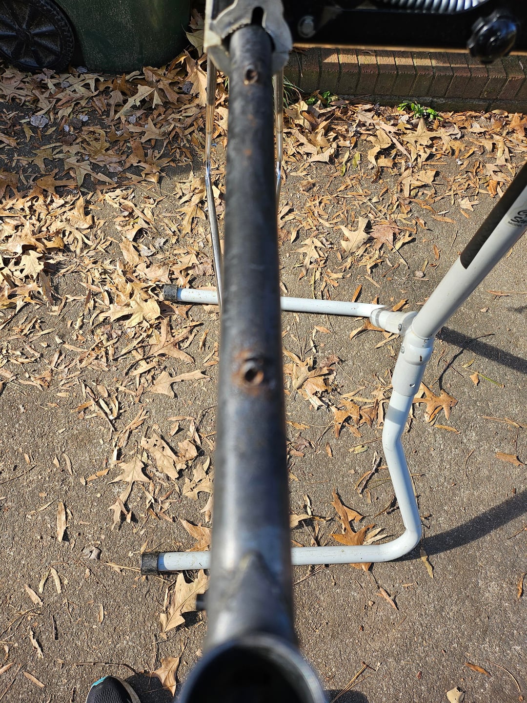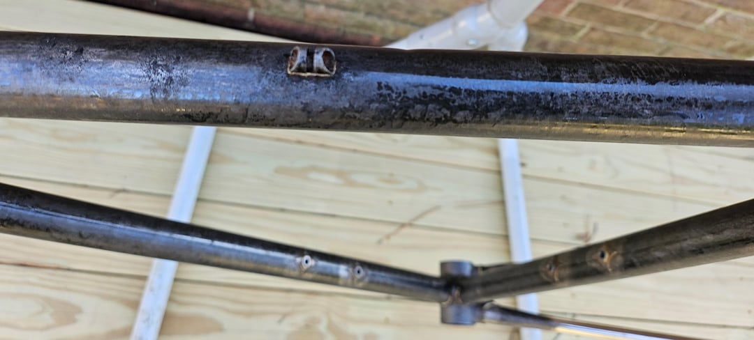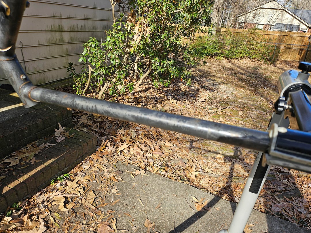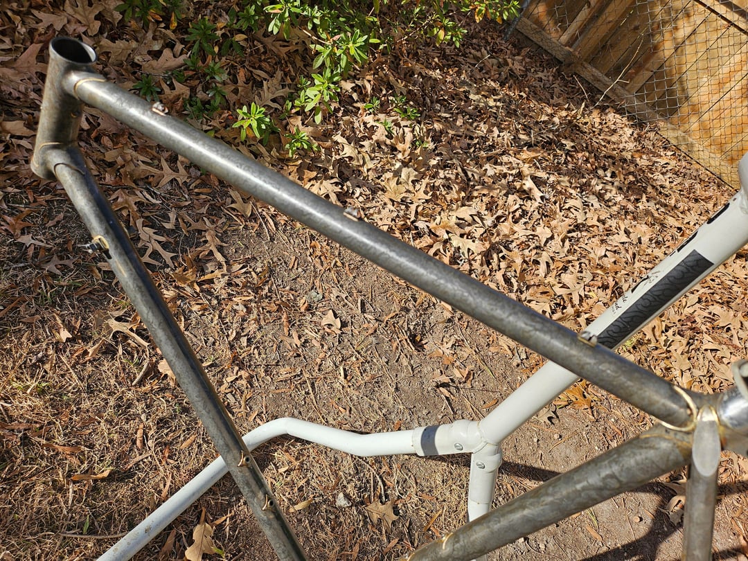 Next step is to get a 1" frame block from Paragon Machine Works to roll out the ding in the top tube, then strip the Rust Block, and paint. Paint will come in two to three months. Gotta wait for good weather, impossible for this home hobbyist at this time of year.
