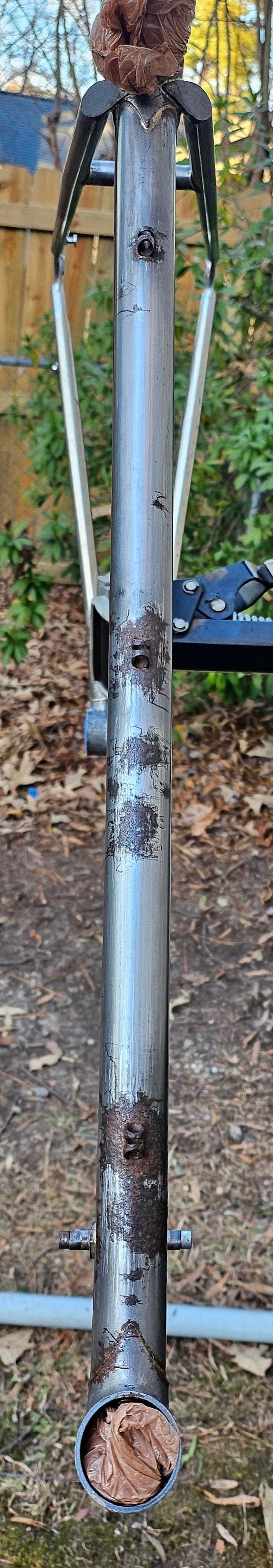 Anyhoo, here are pictures of the process. Paint was stripped using Jasco Premium Paint Stripper. Frame/fork was immersion soaked in Evaop-Rust, rinsed, quickly dried (microfiber towels, a hair dryer, and compressed air to blow out tube internals). After rinse/dry, frame tubes were wiped down with mineral spirits, followed by 99.9% Isopropyl alcohol (inside and out), and finally hit with a couple of coats of Evapo-Rust Rust Block since I'll be storing the frame until the weather improves enough for paint.